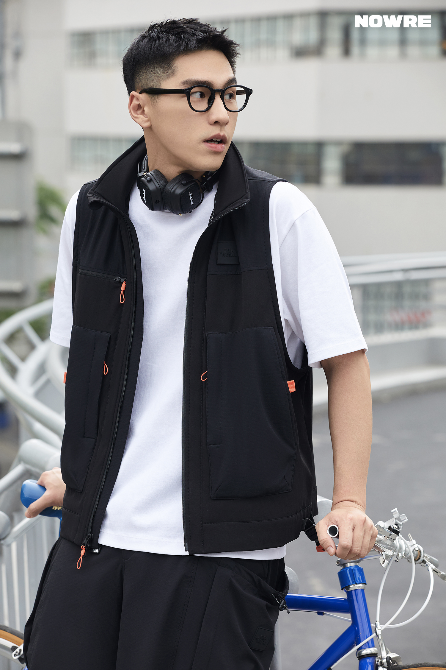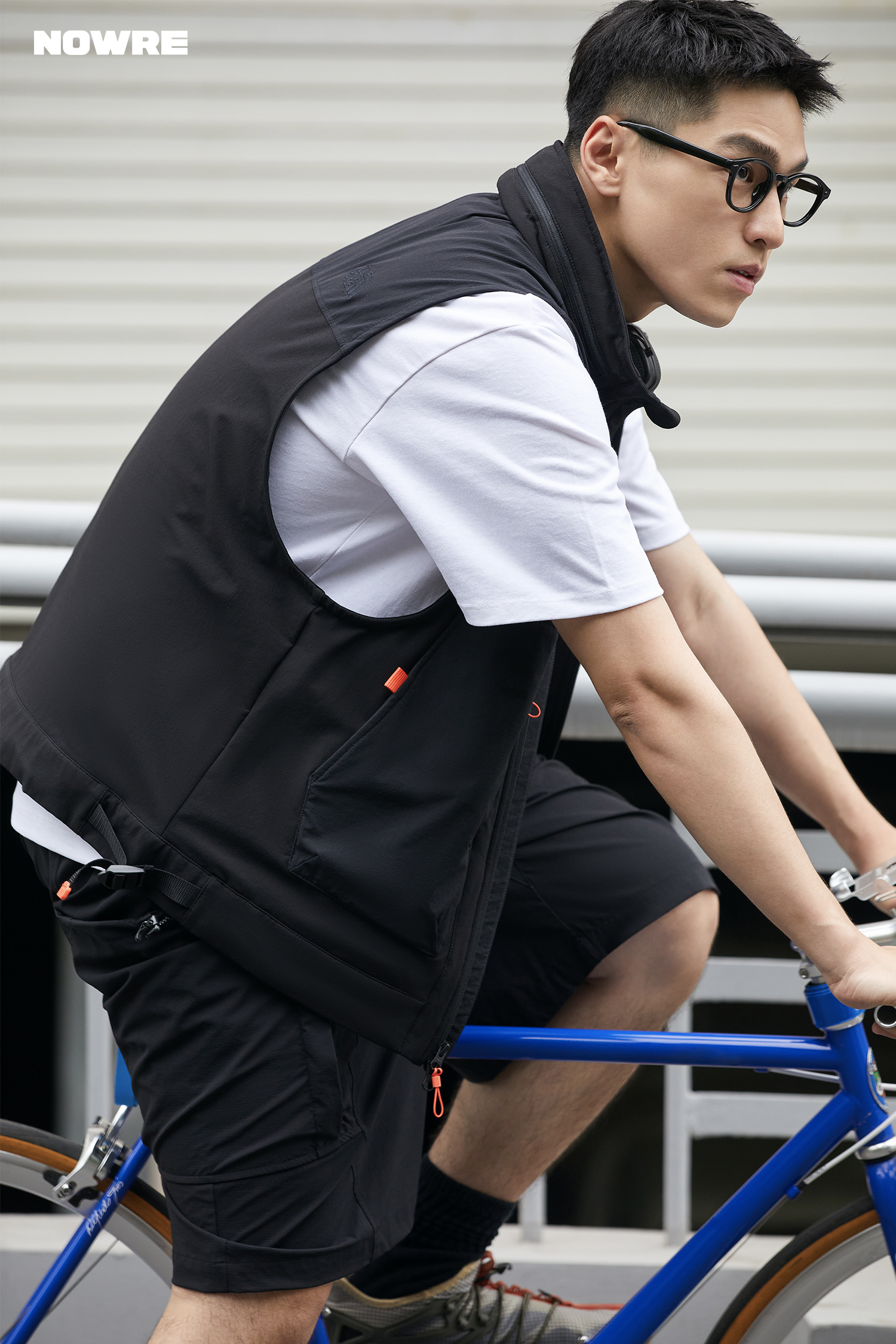 而 JM 穿着的黑白骑行造型,上身是来自该系列的防风连帽马甲(81L9),带有超大立体口袋便于收纳零碎物品,下身则是机能短裤(81LB),后腰添加了可悬挂衣物的拼布设计…这些功能性的设计基本可以取代包袋的作用,让骑行时少一点累赘。另外「黑白配」的百搭性永不过时,通过「撞色」搭配的别样美感,正如该系列主旨——融合都市与户外,模糊两者之间界限。