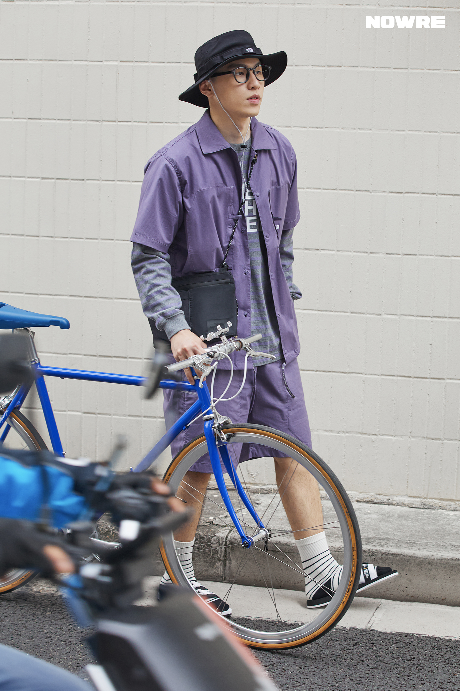 因为我本身就喜欢紫色,这件衬衫的颜色其实不太需要注意颜色搭配,莫兰迪色系的好处就是跟大部分的颜色都很搭,有机能面料的加持更适合搭配机能属性的配件,整体更和谐。