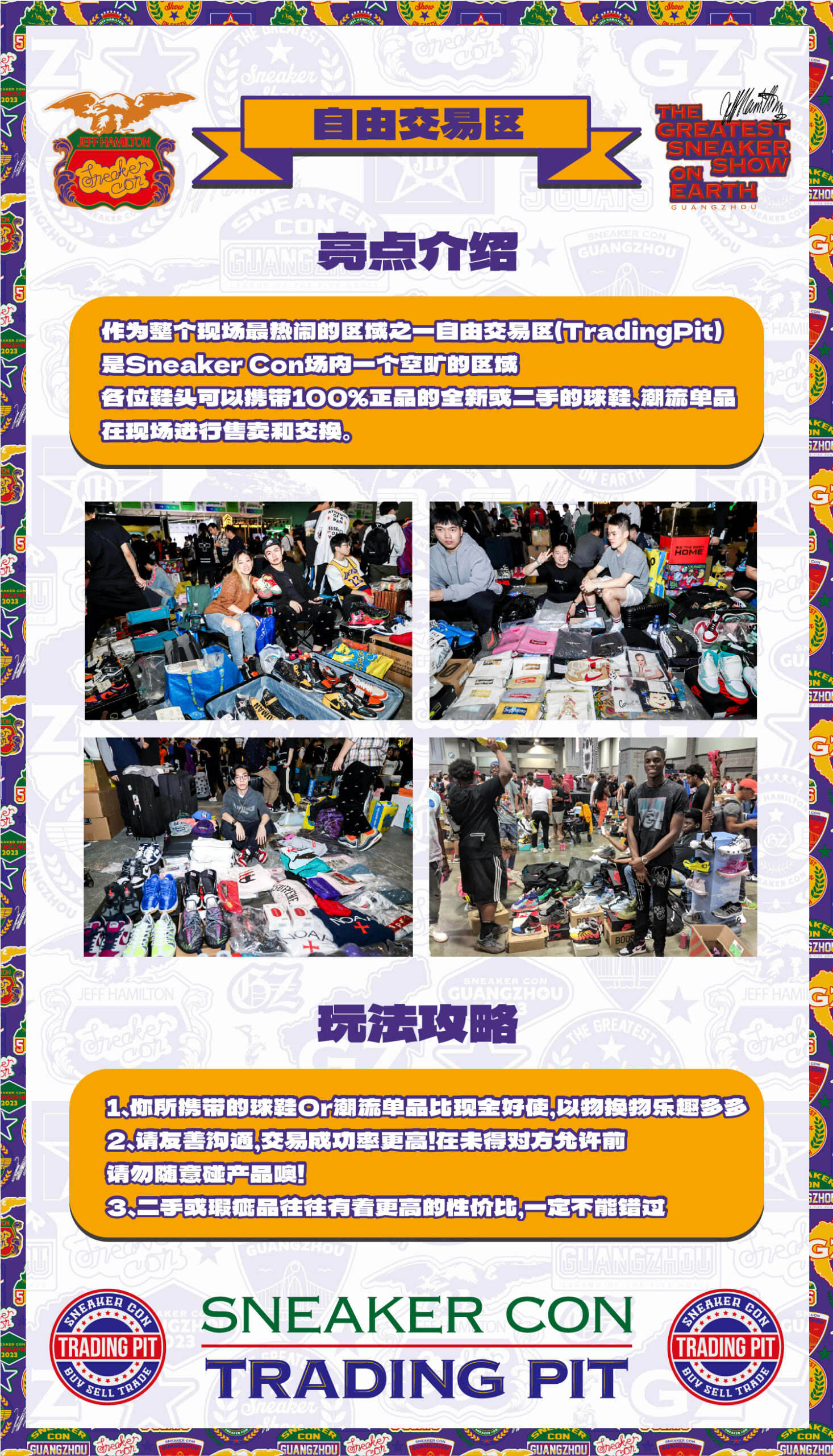 如果有闲置鞋款想要出手,或是想要结交更多朋友?你可以前往 Trading Pit 自由交易区蹲守。作为每年整个现场最热闹的区域之一,鞋头们可以携带正品的全新或二手球鞋、潮流单品来到 Trading Pit 自由交易区进行售卖和交换,只要价格谈得拢…或许还能在这里捡漏到最具性价比的款式。