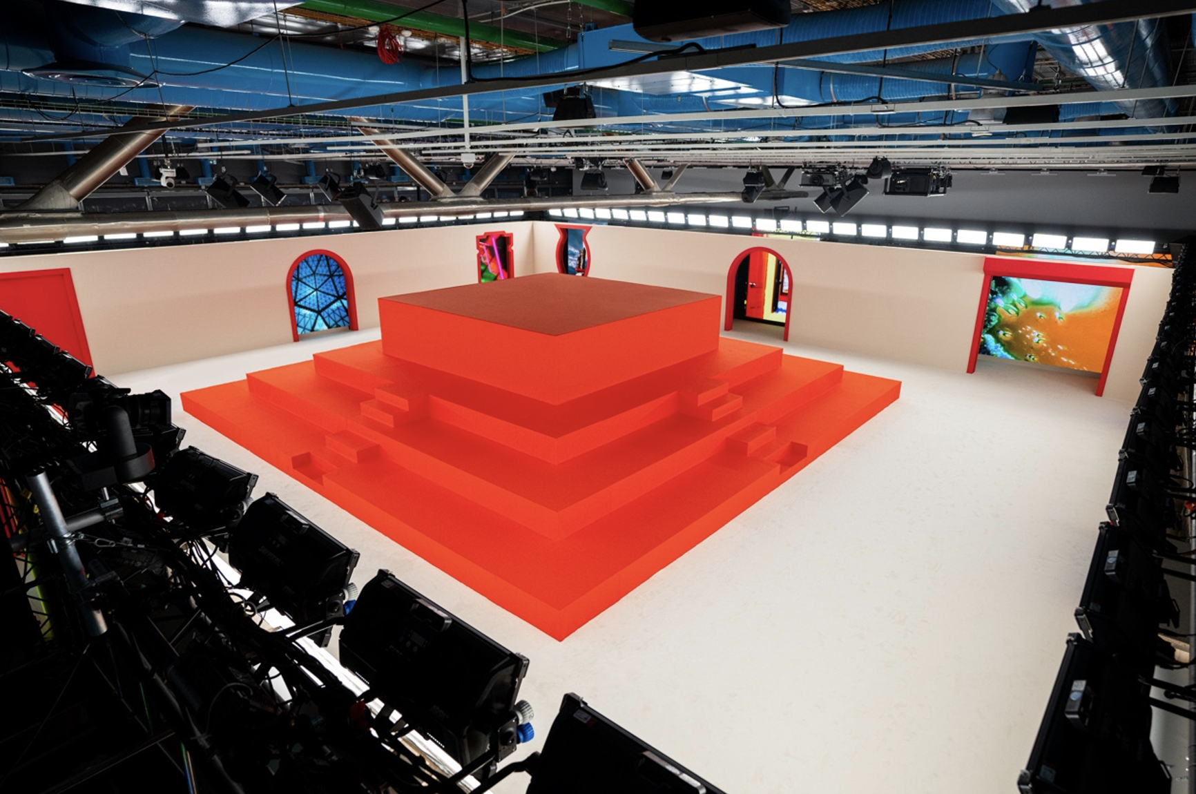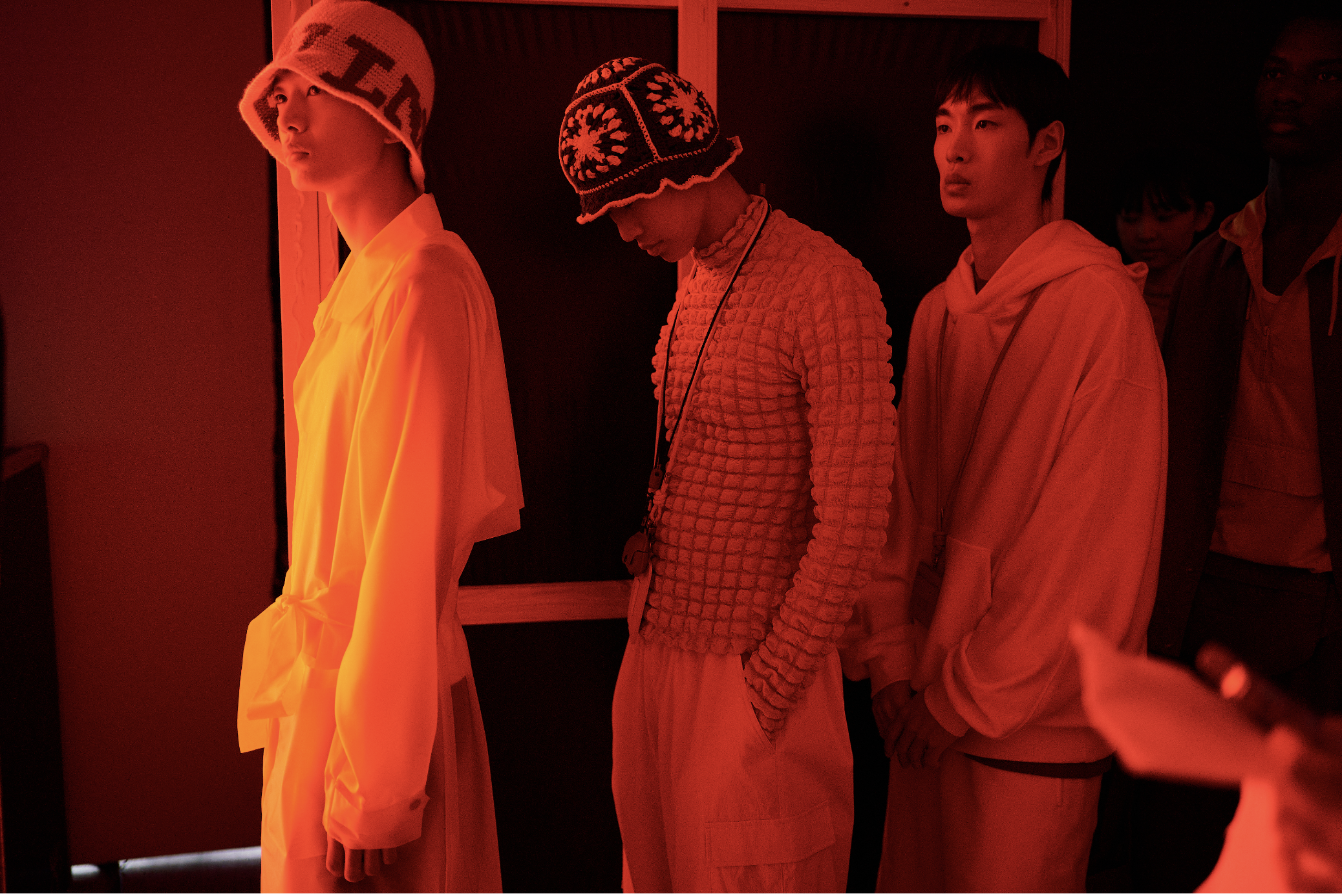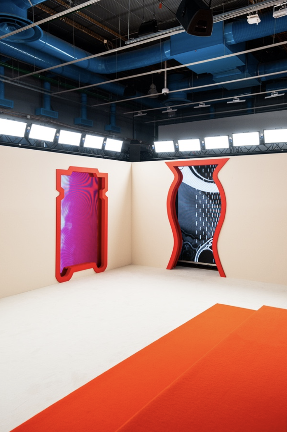 秀场四周墙壁,「八角」、「葫芦」等传统中式门洞,以及法式对开门、电梯门等西式、现代设计,包容了中西文化、古今历史的融合意蕴;而每一扇「门」背后的荧幕上,闪动着由视频艺术工作室 Human Person 制作的视觉内容,通过融合都市地标、生物简图、超现实绘画和其它令人大开眼界视觉内容,表达出中国李宁对潮流、运动、艺术、文化等各领域的精髓汲取与创新突破,也为我们打开了奇幻瑰丽的多元世界之入口。