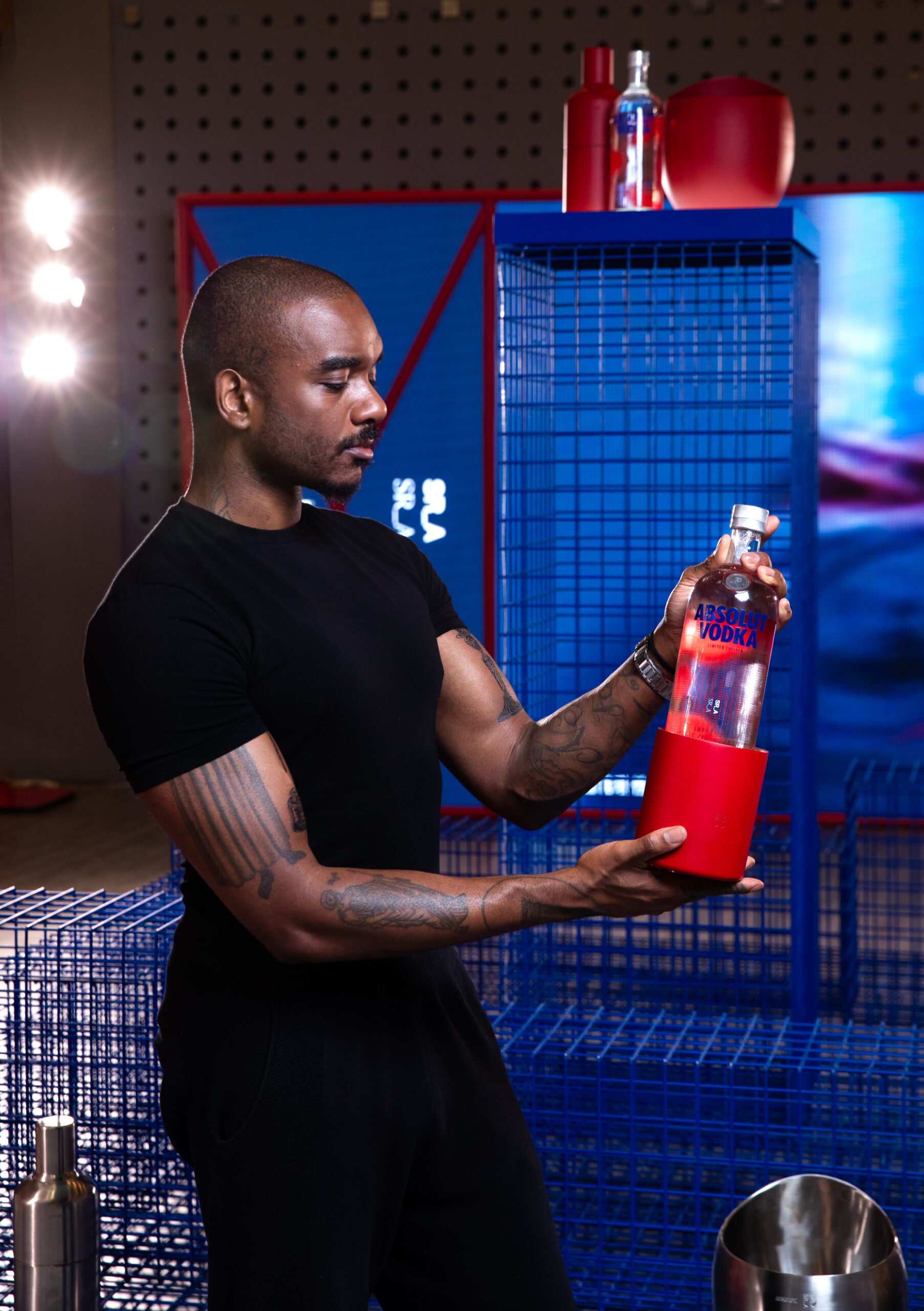 在采访过后,我们尽情投身于快闪活动的氛围中。空间以「中国红」和 ABSOLUT.® 蓝色为基调,表面克制冷静,但内里却有无限热情随时爆发,Samuel Ross 时隔多年来到上海,在现场除了与朋友粉丝拍照外,随后还上台揭幕 ABSOLUT.® x SR_A 限量瓶,向大家分享设计心得。
