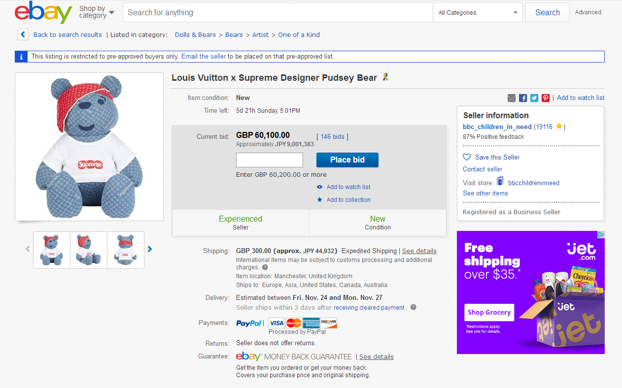 你没看错,就是 52 万元人民币。在上周的墙外世界中我们就为大家介绍过,为了支持儿童公益项目 BBC Children in Need,Louis Vuitton 推出了一款 Supreme 联名玩偶熊,这只玩偶熊将会放在 eBay 平台上进行拍卖,拍卖所得的全部金额将会用于资助需要帮助的儿童。而在经过这么多天之后,目前它的最高竞价已经达到了 60100 英镑,折合人民币约 522262 元,价格已经直逼 Supreme x LV 系列中最昂贵的滑板箱套装,然而目前距离竞拍结束还剩下将近 6 天,看来它很有可能就要成为这一系列中最昂贵的单品了。