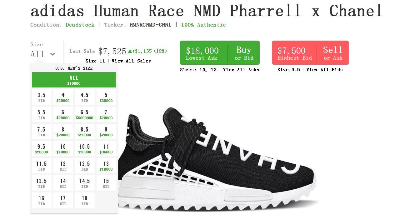 继网上传出消息之后,大家翘首以盼的 Chanel x Pharrell x adidas Originals 联名 HU NMD 终于在前天开启了官方登记,到今天为止,中签的幸运儿应该已经到 colette 门店领回自己的宝贝了。既然如此珍贵,相信想要花高价从转卖市场入手的实力 Sneakerhead 们也不在少数,不过…你得大概了解一下它目前的价格。国外知名转卖购物平台 StockX 的网站上已经出现了这双鞋款的货源,价格你也看到了(当然部分尺码标注的 1 百万美元的价格一定是闹着玩的),最低也要大概 18000 美元,所以说不准备个最少 10 万元人民币,劝你还是放弃吧。