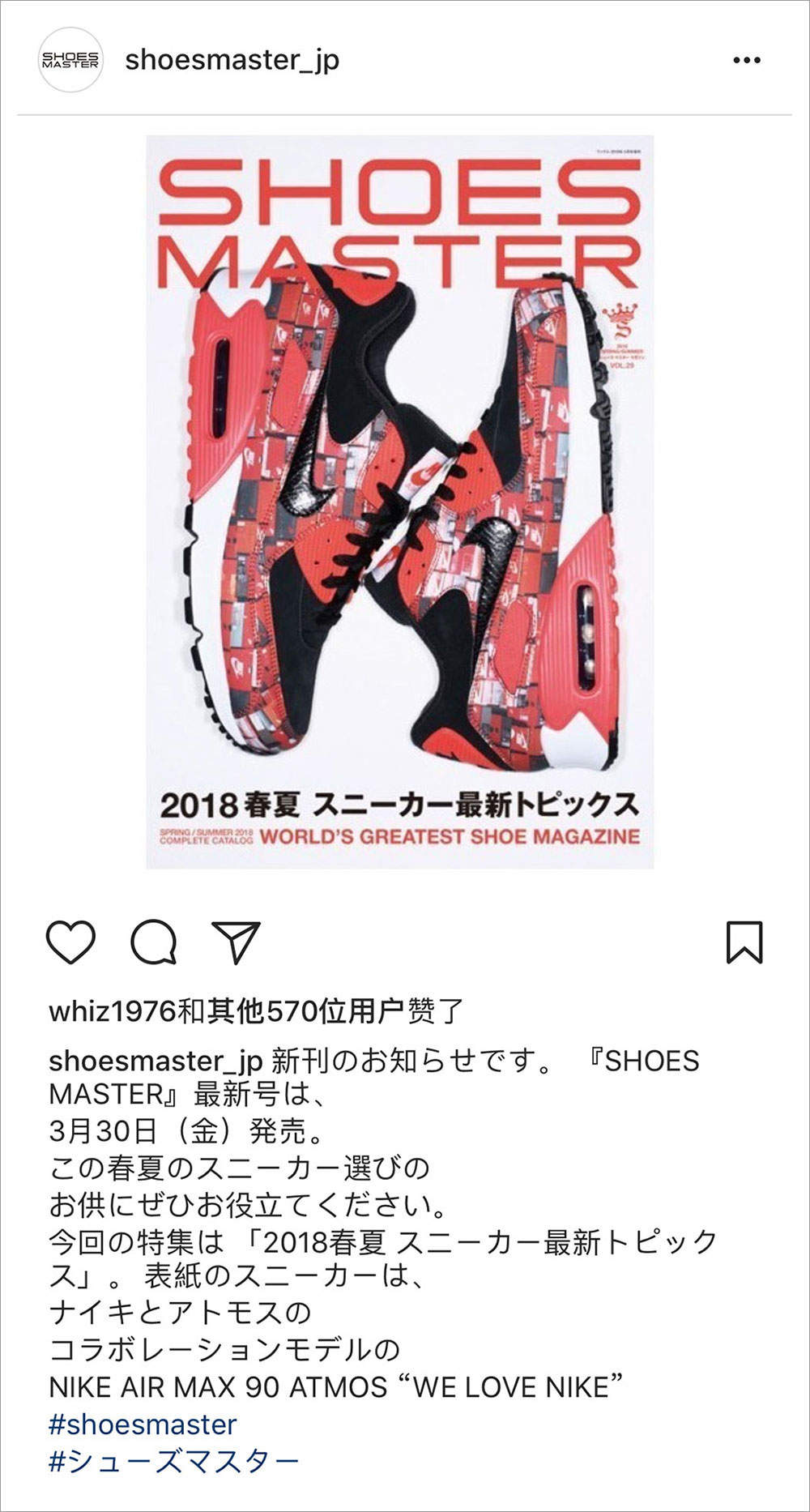 本以为最近的众多新鞋款已经足以让 Sneakerhead 们好好满足一下购买欲了,但今天球鞋杂志 《SHOES MASTER》 又无预警的为我们带来了一个新的惊喜。正如最新刊杂志封面中所展示的,这是一双名为 “We Love Nike” 的 Air Max 90 新设计,其将 Nike 以往的经典鞋盒呈现在了鞋身之上,对于“老鞋头”们一定有着不小的吸引力,而至于何时发售,继续关注我们就能知道了。