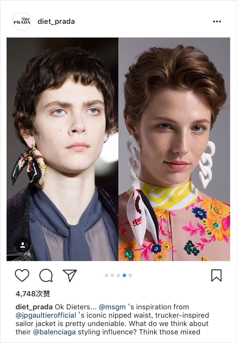 MSGM 是设计师 Massimo Giorgetti 于 2008 年在意大利创立的服装品牌,发展至今也成为了很红的设计师品牌之一。而近日该品牌被揭发抄袭,而图片中拿来对比的就是严重抄袭的产品。从第一张图片中的女装腰部的收腰剪裁手法是法国高端时装设计师 Jean Paul Gaultier 的标志性设计,可以看到另一边 MSGM 的上衣很好地对其 “借鉴” 了一番,就连背后的条纹元素也不放过,大家再看看 Balenciaga 的花卉长裙、围巾领带耳环以及牛仔夹克,MSGM 几乎把这些产品百分之八十的设计元素全照搬了…… 抄袭这一行为在服装界可以说是禁忌了,而在当下,MSGM 的产品在许多很红的买手店都有售卖,如今被揭发抄袭不知消费者还愿意为其买单吗,你们又是怎么看呢?