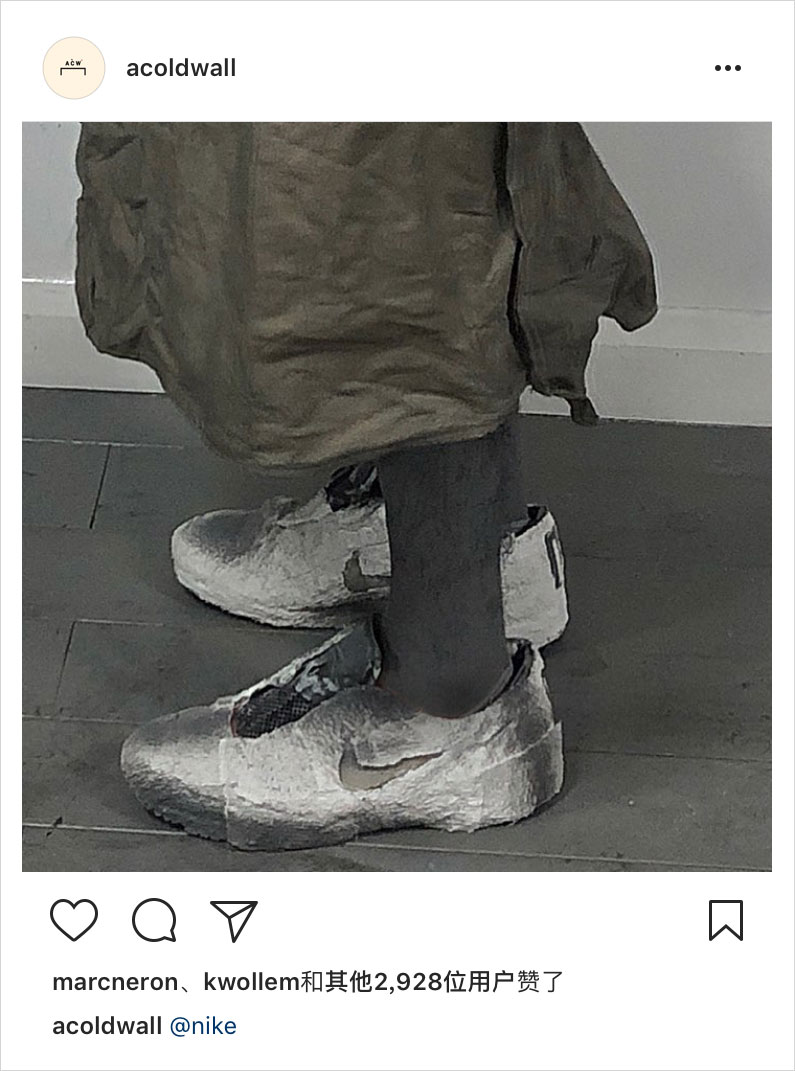 不知道大家是否还记得 A-COLD-WALL* 与 NikeLab 合作打造的 Air Force 1 ,当时一经发布便成为了热门鞋款,而近日 @acoldwall 晒出一张类似渲染图的鞋款,其中明显的 Swoosh 让人惊疑这是又要联名了?但可惜的是图片并不清晰,虽然鞋款有着 A-COLD-WALL* 擅长的工业风,可是外侧的一层包裹物又让人产生疑问,这真的是一双 Nike 的运动鞋吗?你们怎么看呢?