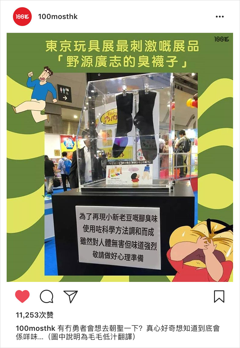 喜欢看《蜡笔小新》的朋友一定记得,在动漫中小新的父亲野原广志的袜子可以说是小新最害怕和讨厌的物品之一了,每次父亲野原广志一回家脱袜子,就会遭到家里人的嫌弃。近日东京的一个玩具展会就根据动漫中这一生活趣事做出了野原广志的袜子…… 对你没看错,就像图中的附文,为了完整呈现动漫中小新老爸的脚臭味,展会可以说是百分百还原了这个味道,虽然对身体无害,但是味道很强烈。很独特也很有趣,你们会去试一试吗?