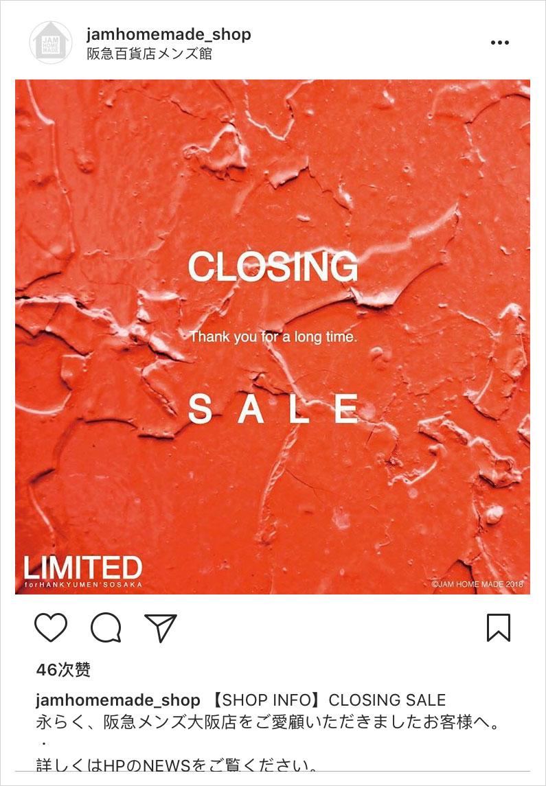日本知名首饰品牌 Jam Home Made 在大阪的阪急男子门店预计将在今年 7 月份关闭,在闭店前的这段时间里门店将针对大多数产品给出特别优惠,以此来感谢客户一直的支持,据了解,该门店在 2008 年 2 月 1 日开业时就明确了大阪的实体门店只会开放十年零五个月,所以请大家掐指一算,闭店时间就是今年的七月份,Jam Home Made 大阪店官方表示,将在闭店的这段时间继续提高产品的质量和生产水准,目前尚不明确再次开业的时间,但是这种十年一次的门店大促销大家可不要错过啦。