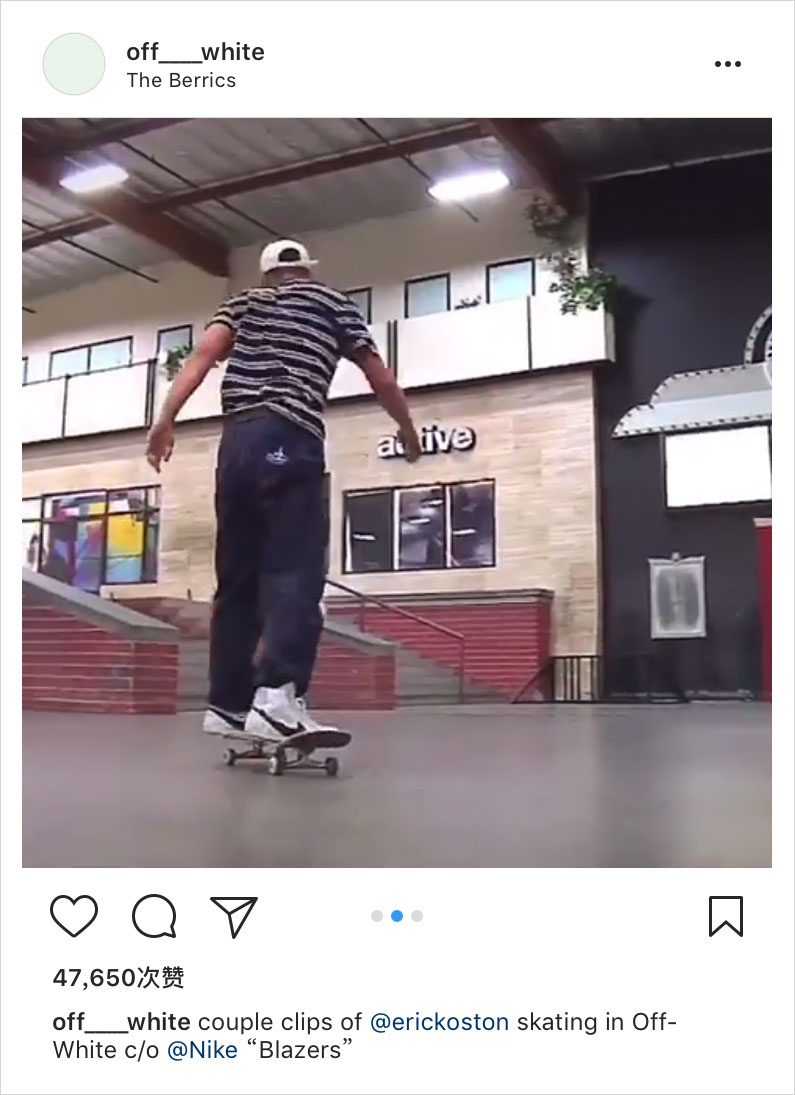 近日著名滑手 Eric Koston 穿着 Virgil Abloh 和 Nike 联乘系列 The Ten 中的 “ Blazer” 鞋款来滑板并录了几个特写镜头,虽说 “Blazer” 是去年发售的鞋款,但至今还是属于火热鞋款的范畴之列,但相信大家的关注度很少在图片中的 Virgil Abloh “Blazer” 上吧,毕竟该鞋款属于 Nike 的滑板鞋,买来不滑板有些可惜,滑板又不舍得……不过大家不用太矛盾,可以看看 Erik Koston 的滑板镜头过过瘾。