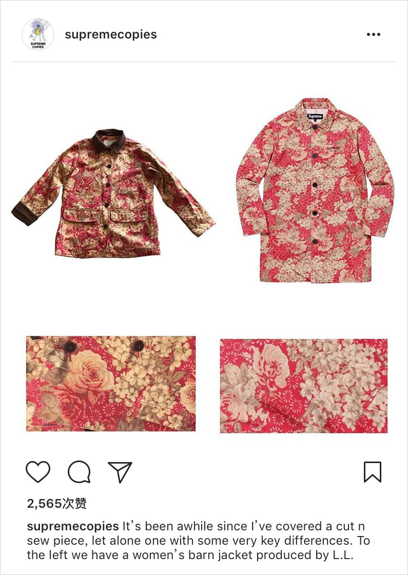 就像你们在图片中看到的,图中两件衣服的相似度达到了百分之九十,左边的是 L.L.Bean 在 90 年代推出的女性夹克,可能大家对这个牌子不是特别熟悉,L.L.Bean 是 1912 年在缅因州成立的服装公司,市值十亿美元。右边是 Supreme 于本季早些时候发布的工装风衣,很明显 Supreme 的这款风衣的灵感就来源于 L.L.Bean 的女性夹克,只不过没有采用夹克的灯芯绒衣领和灯芯绒内袖,因为是风衣版型所以也没有前袋,而印花方面 Supreme 也没有 L.L.Bean 做的专业,从图片下方的放大图可以看见 Supreme 的印花略显白色且相对左边的印花图案线条质感稍差一些。当然,Supreme 的这款风衣一经发售还是得到了大卖。