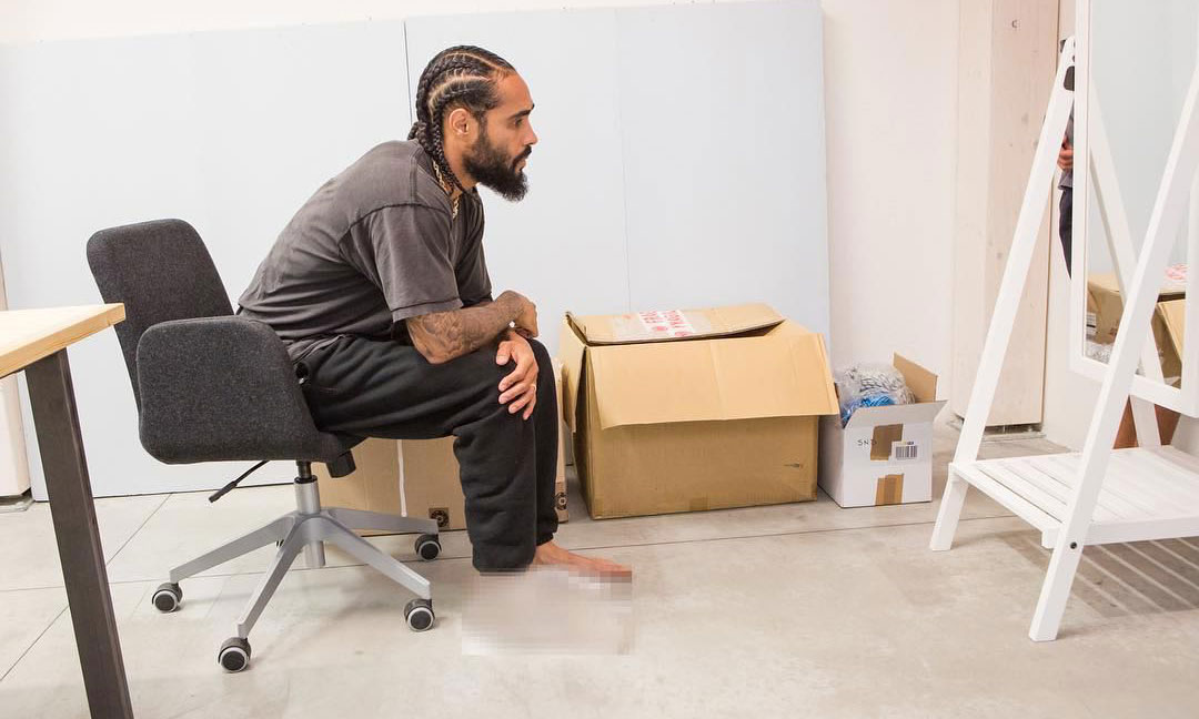 4. Jerry Lorenzo 展示新的鞋款,但怕被抄袭打了马赛克