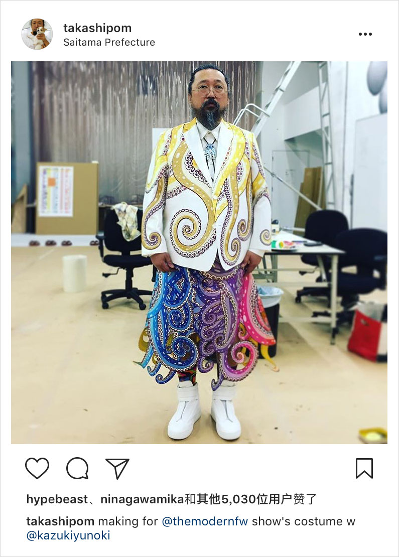 村上隆近日在 Instagram 上秀出一身非常 “亮眼” 的穿搭,结合他知名艺术家的身份相信大家也能猜得出,这必定是村上隆要出现在某艺术展的穿搭了,果不其然,图中的服装是村上隆出席 “章鱼吃自己的腿” 艺术展中的穿搭,而图片中的服饰从头到尾的章鱼脚设计也是彰显了展会主题,村上隆也是当天展会的主角。而附文中圈到的 @kazukiyunoki 是设计了图片中村上隆穿搭的造型师,据悉该造型师已经不是第一次和村上隆进行合作了,在之前村上隆和 UNIQLO 合作系列的活动中,村上隆在活动当天的穿搭就是该造型师设计的。