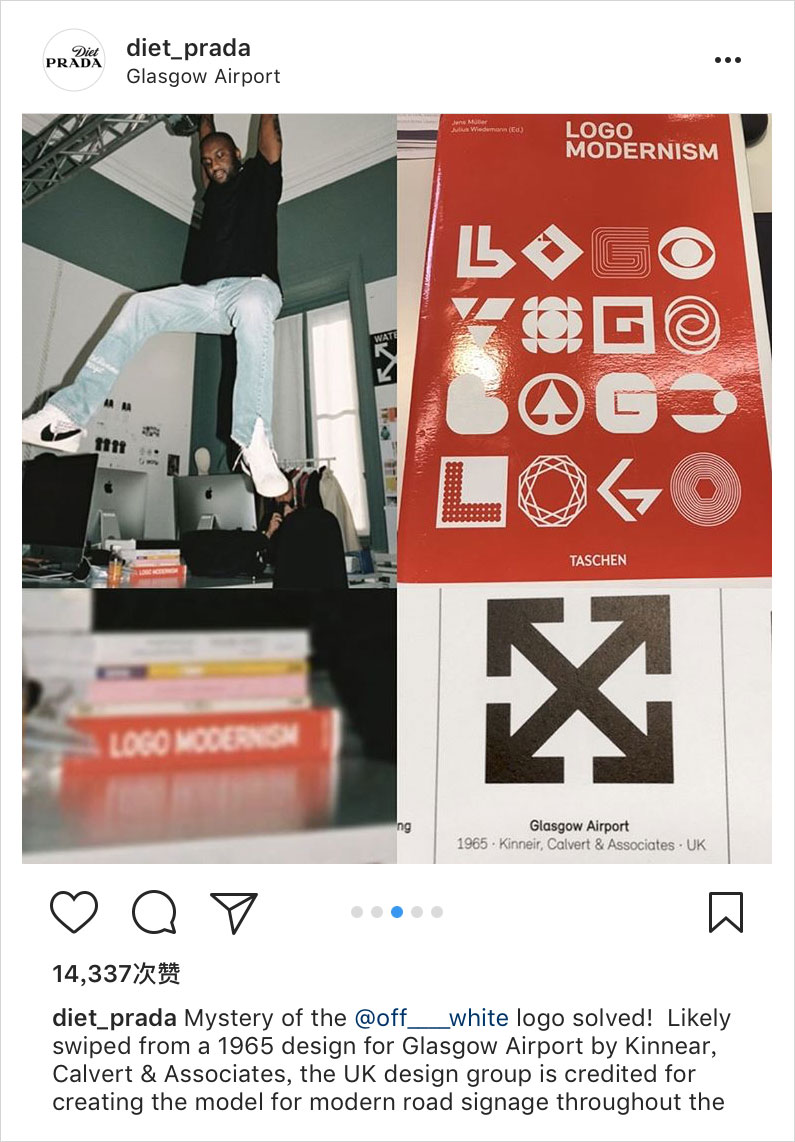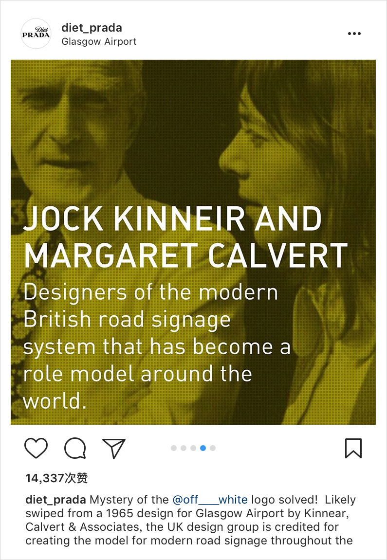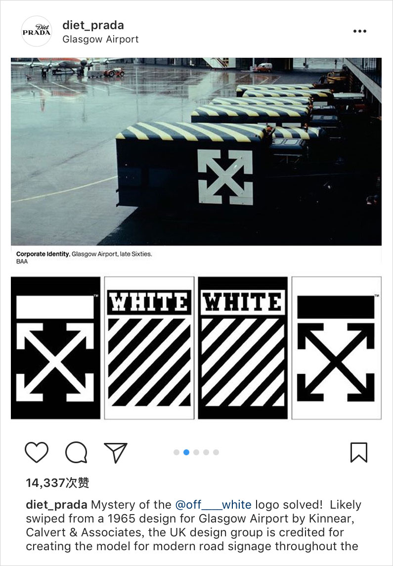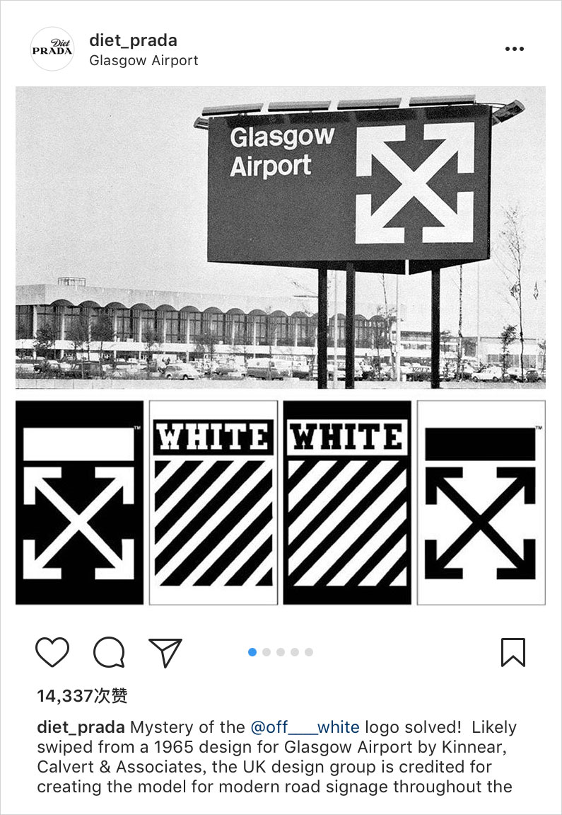 提到 Off-White™ ,都会联想到它独特的米字箭头和减速带 Logo ,Virgil 在 2014 年春夏将 Off-White c/o Virgil Abloh™ 一经推出,就在服装领域掀起了 Neo-Street 美学的热潮。那么,Virgil 都是如何想到这些设计的呢?@diet_prada 近日就发现了位于苏格兰格拉斯哥机场 60 年代的 Logo 与 Off-White™ 的经典 Logo 非常相似,据了解,该机场的 Logo 当时是由英国的设计公司 Kinnear,Calvert & Associates 设计的。大家在照片中可以看见熟悉的白色箭头标志以及黑色和黄色的条纹,这两大元素在 Off-White™ 的产品中经常出现。对于这件事,你们怎么看?