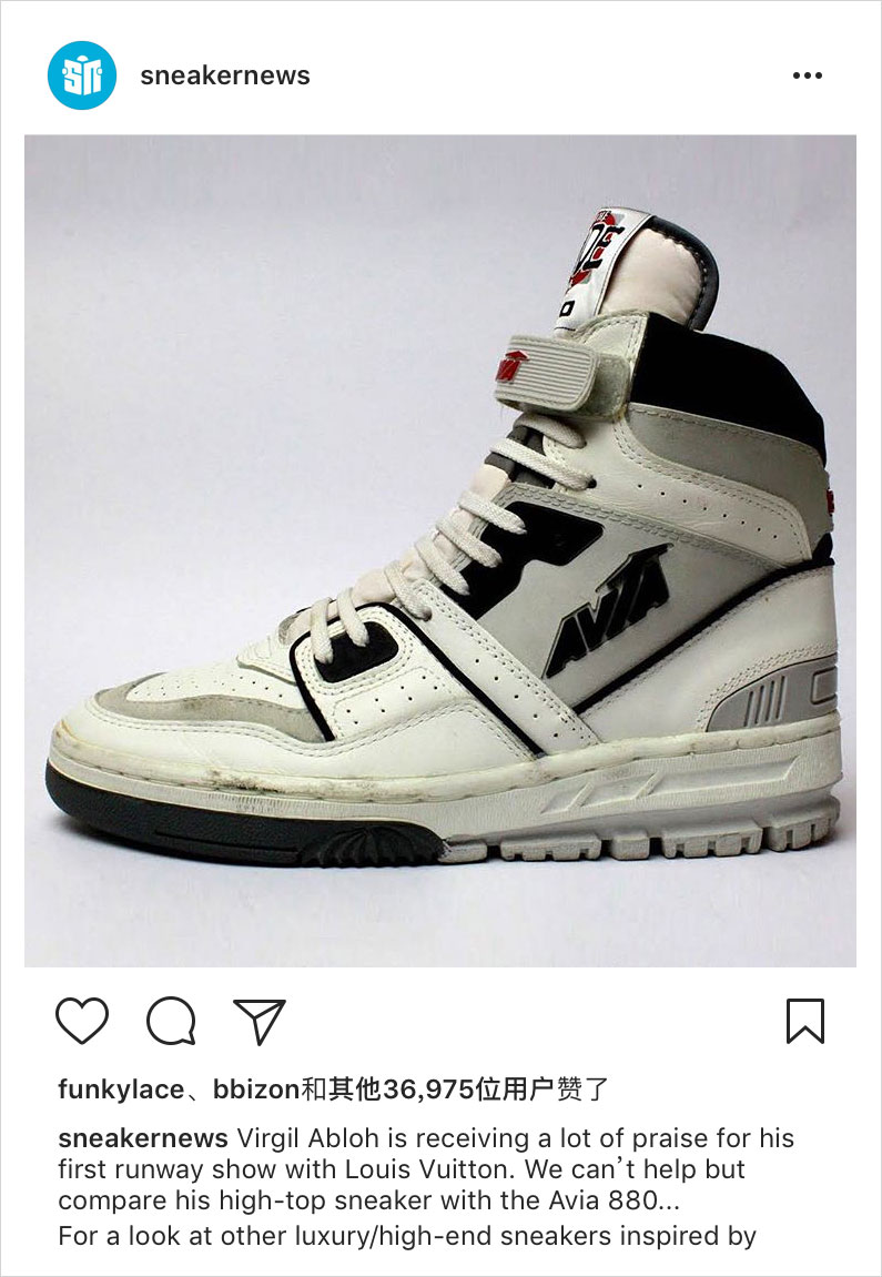 相信大家已经在 Louis Vuitton 男士时装秀中看到了 Virgil 为 LV 打造的运动鞋,与 “The Ten” 的结构外观不同,该鞋款配备了 LV 的高端美学。而鞋款中的 LV 吊牌这一设计被网友指出,这不就是 Air Jordan 的吊牌吗?回想起 Virgil 曾经就对该鞋款的设计说到 “我认为这就是一款经典运动鞋” ,所以 Virgil 此举也许是一种致敬,而 @sneakernews 近日也将 AVIA 880 的鞋款图片搬出来并指出,这双鞋没准也是 Virgil 的灵感来源?
