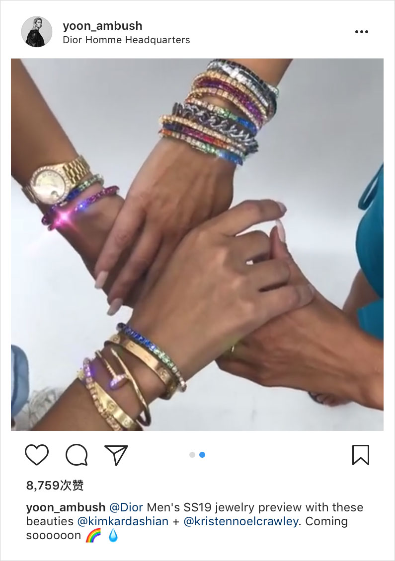 在这次的巴黎时装周期间,除了 Virgil 的 LV 男装首秀之外,另一位设计师的时装秀也同样值得关注,那就是 Kim Jones 的首次 Dior 男士系列。虽然 Kim Jones 的作品走秀是在本周六,但 AMBUSH 主理人 @yoon_ambush 日前就提前晒出了此次走秀中的珠宝系列。视频中的珠宝首饰由 Kim Kardashian 和 Kristen Noel Crawley 进行试戴,五颜六色的珠宝看起来就像彩虹一般,在这些闪闪发光的首饰中可以看出,Kim Jones 此次的 Dior 首秀也许并不 “低调” 。