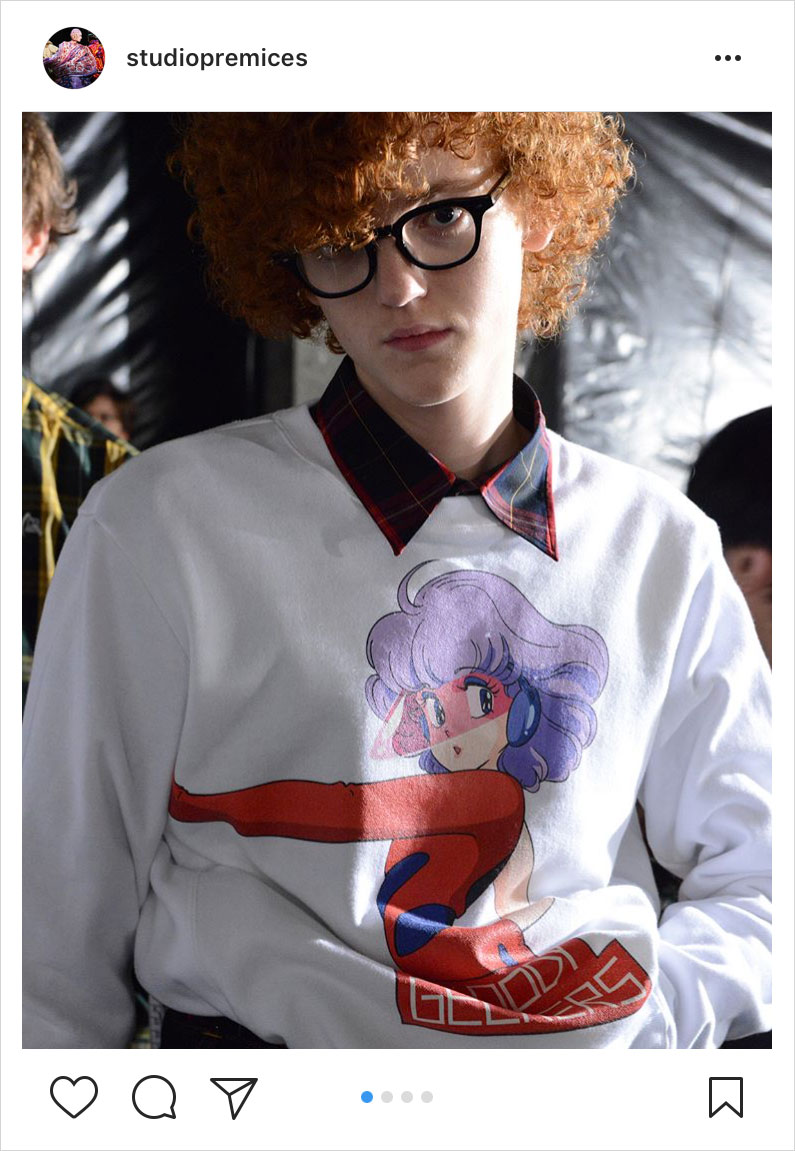 不走寻常路的 UNDERCOVER 在 2019 春夏发布会再次让人大开眼界,这一次他们以 1979 年的经典电影《The Warriors》为灵感,这部电影讲述的是一个八人团队在帮派斗争和警察堵截的环境下打出一条道路回到自己地盘的故事,所以 UNDERCOVER 对照电影将整个系列分成了八个主题,在这些主题中,BLOODY GEEKERS 使用了动画片 “魔法の天使クリィミーマミ” 中的角色,以此突出日本御宅文化的主题,而手中拿着的 “铁锤” 在简单的搭配下也透露一丝 “帮派” 气息。在被高端和奢靡风气包围下的巴黎时装周之中,UNDERCOVER 的走秀可以说是非常独特了。