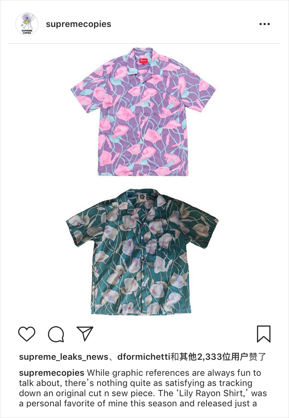近日,账号 @supremecopies 再次抓住了 Supreme 的 “漏洞” ,那就是今年春夏系列中的 “Lily Rayon Shirt” ,一件由人造丝制成的衬衫,该账号指出,衬衫中的百合花卉图案最开始是由夏威夷的 Hilo Hattie 品牌推出的,哪怕到今天这样的花卉特色该品牌也一直在使用。虽然找不到这两件衬衫图案设计的参照物,但该账号也非常肯定的说,两者的极高相似度必然存在着些联系。
