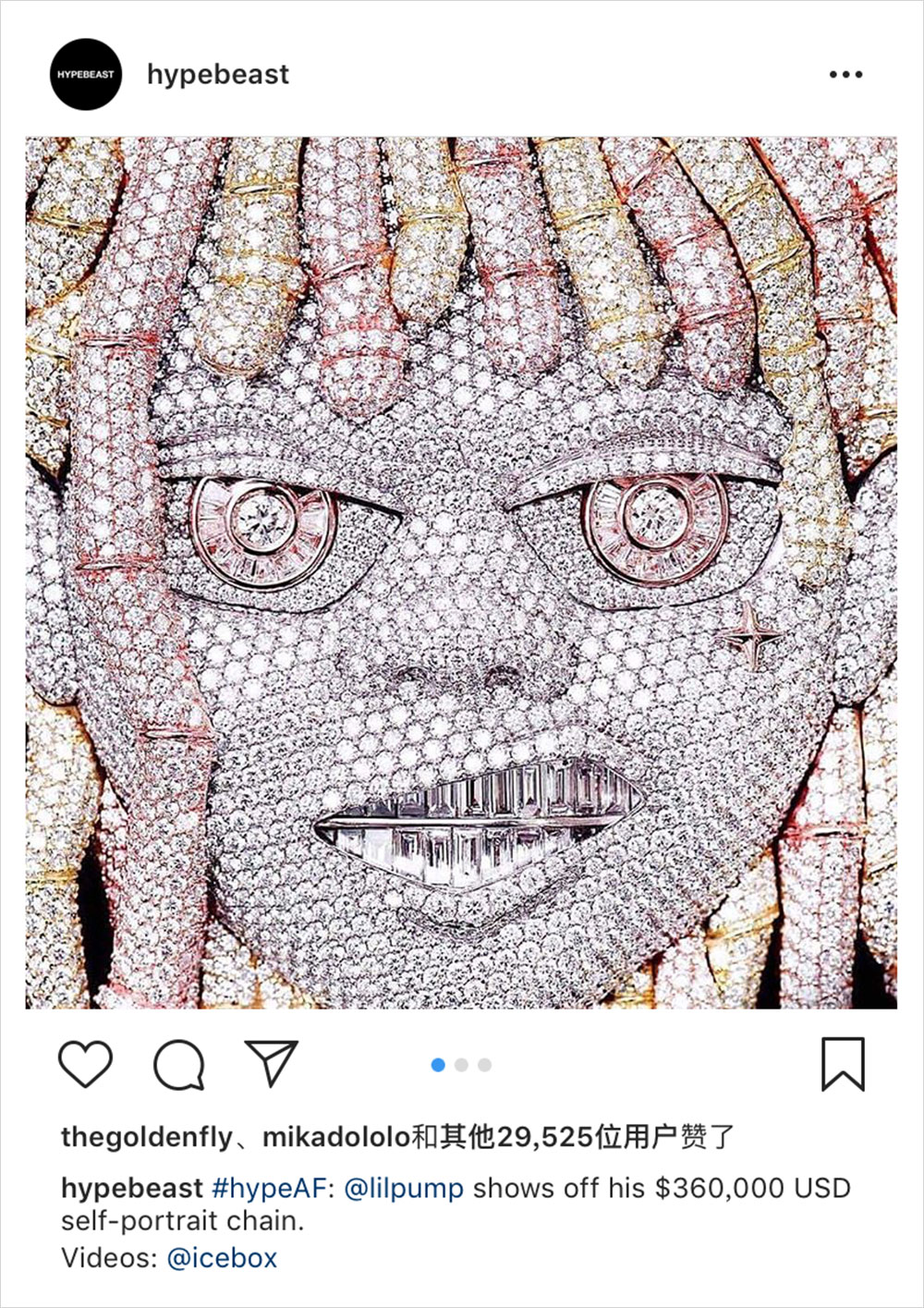 奢靡风气似乎在年轻一辈的饶舌歌手中非常流行,早前 6ix 9ine 就曾秀出他花费 30 万美元定制的钻石项链,而刚入选今年 XXL Freshman Class 的 Lil Pump 已经超越了这个记录。日前,Lil Pump 在 Instagram 上晒出了根据自己面部形象定制的一条项链,声称花费了 36 万美元打造,价格非常高昂。还记得 Lil Pump 曾在与 J.Cole 的交谈中说到自己有存钱的习惯,但是目前看来…… 当然,也有可能是这名优秀年轻的音乐人有着很可观的收入,你们认为呢?