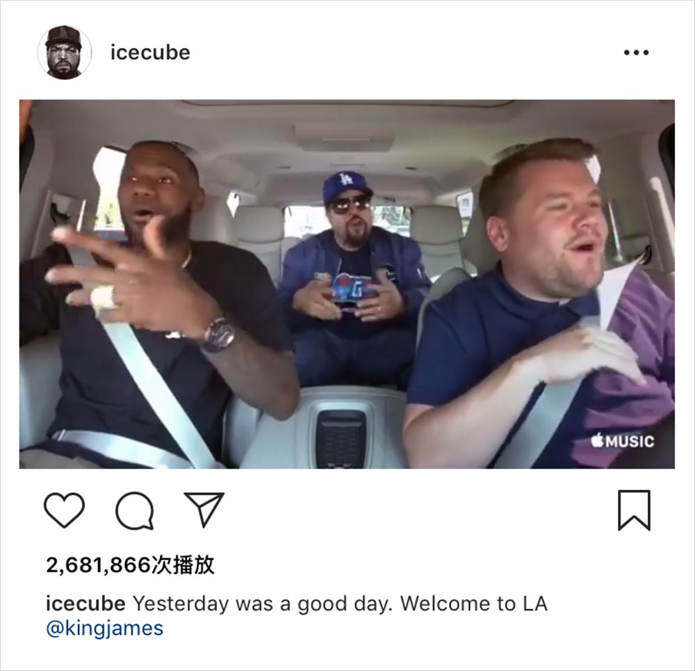 自从詹姆斯携家眷抵达洛杉矶确认加入湖人之后,身处在当地的球迷热情十分高涨,就连西海岸最具代表性的说唱大佬 Ice Cube 都忍不住晒出早前和詹姆斯在《Carpool Karaoke》中一起演唱《It Was A Good Day》的视频,就像这首歌的名字,Ice Cube 在附文中说到,詹姆斯的到来,就是美好的一天。