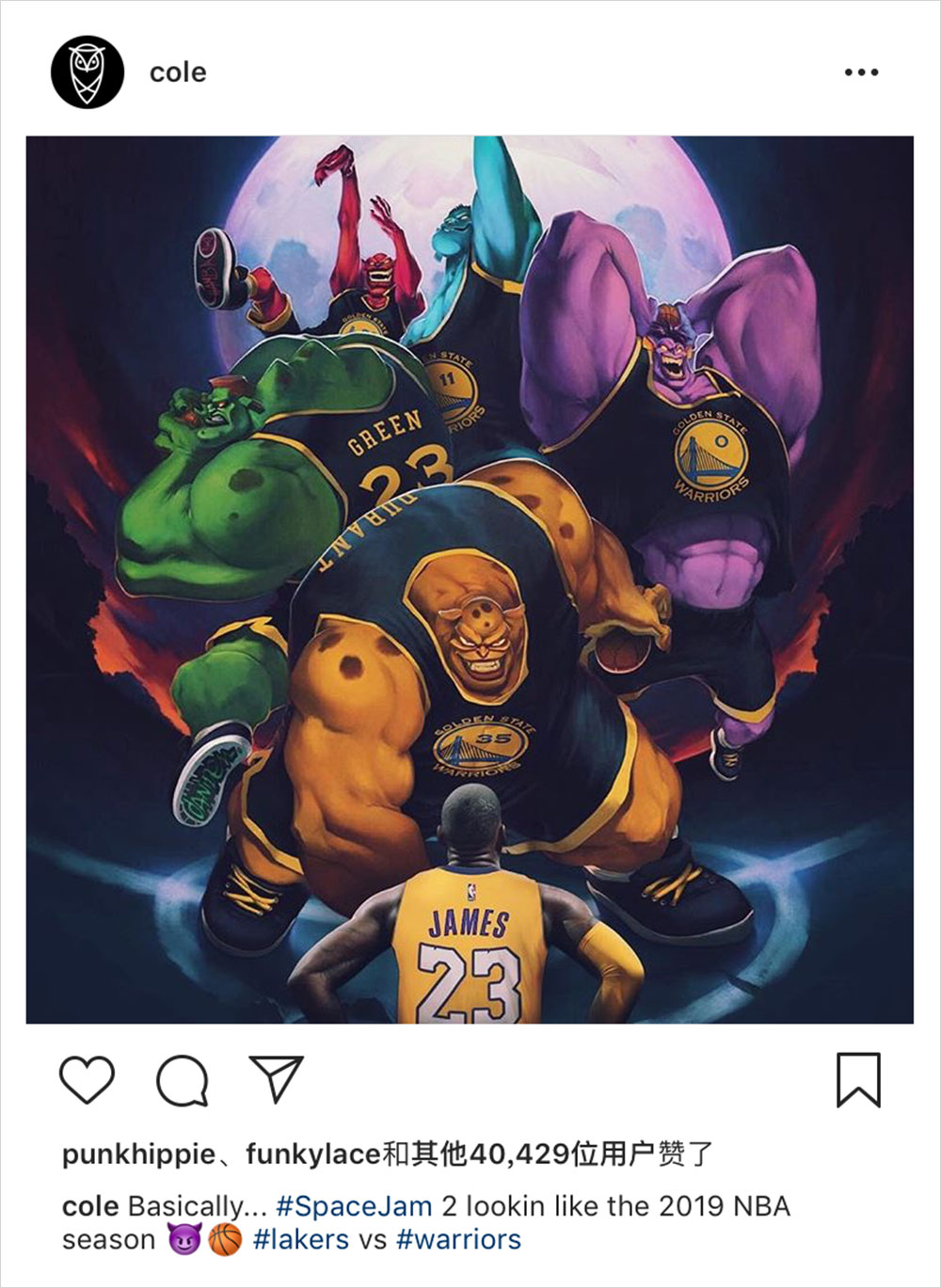 相信大家都有听过由詹姆斯主演的《空中大灌篮2》没多久就会发布预告的传闻了,不知道你们还记得第一部的反派 The Nerdlucks 吗,在电影中,他们具有盗取他人技能的能力,因为 Nerdlucks 吸收了五位 NBA 明星的能力变身为 Monstars ,才使得乔丹在与之比赛篮球时显得极为艰难(不知道剧情的朋友可以补一补啦)。日前,艺术家 Jeff Cole 就晒出了结合电影剧情和实事而设计的一张插画,内容是身着湖人队 23 号球衣的詹姆斯面对吸收了金州勇士队能力的 Monstars ,非常有趣,不知道这样的电影剧情是你们想看到的吗?