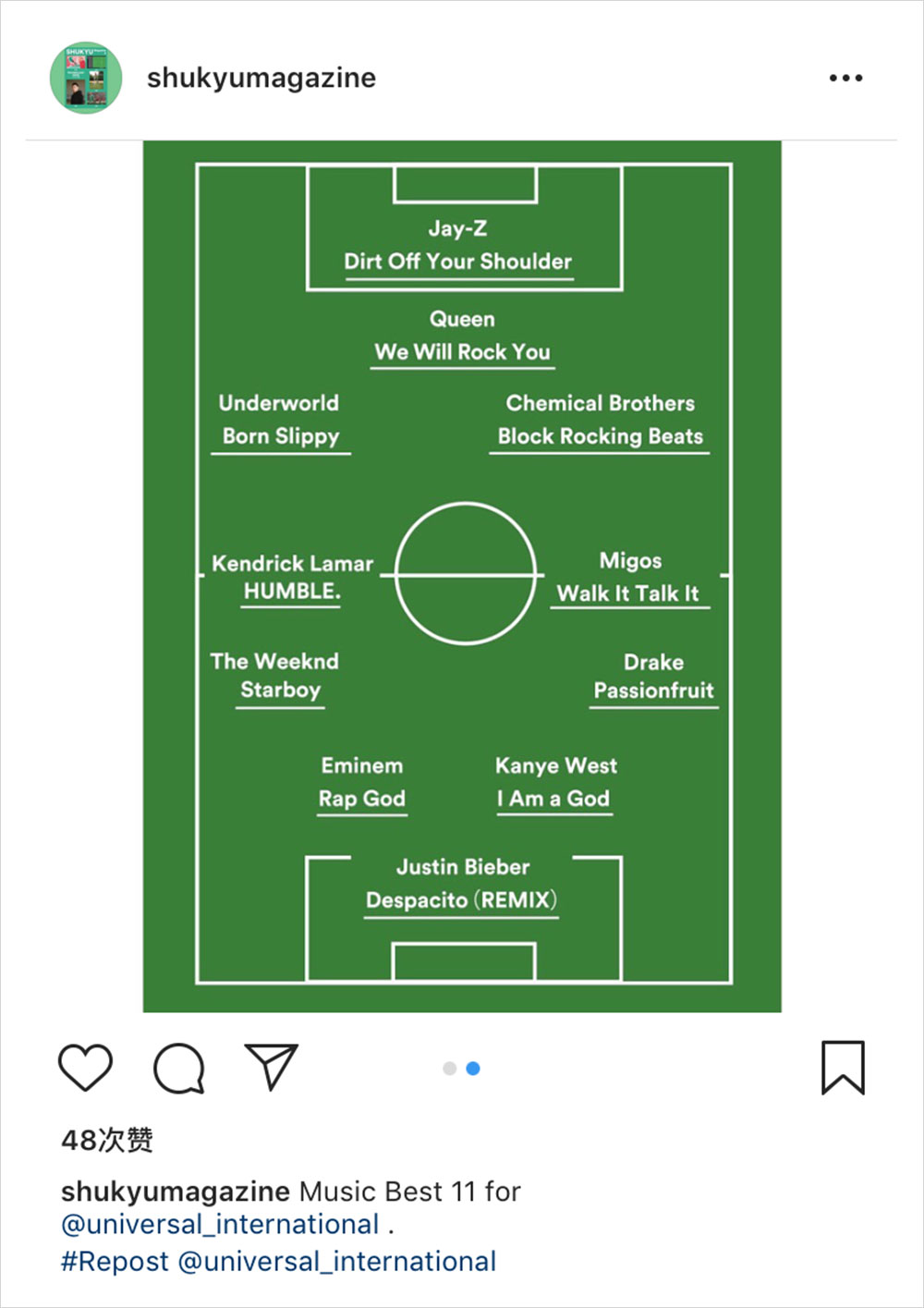 日本足球文化杂志《SHUKYU》根据日本环球音乐的最佳 11 首单曲就足球的 “3-4-3” 阵容设计了一张插画,在图片中可以看到不少大家熟悉的热门单曲,其中 Kendrick Lamar 的《HUMBLE》和 Migos 的《Walk It Talk It》的流行程度就相当于前锋,而 Eminem 的《Rap God》和 Kanye 的《I Am God》的经典程度就是后卫,Justin Bieber 的《Despacito(REMIX)》和 Jay-Z 的《Dirt Off Your Shoulder》的耐听程度就相当于守门员。你们认为呢?