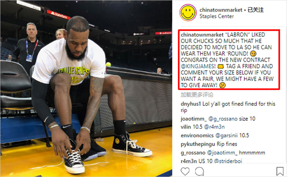 早前我们曾报道了街头品牌 Chinatown Market 将他们恶搞 Nike 和 CONVERSE 的鞋款 “SWOOSH 1970’S” 赠送给了詹姆斯,而这位 Nike 终身代言人也真的上脚了这双恶搞之作。最近因为詹姆斯搬到洛杉矶,Chinatown Market 之后便在 Instagram 上再次晒出詹姆斯上脚此鞋款的照片,并声称詹姆斯因为喜欢这双鞋款,所以他决定搬到洛杉矶(其实是为了签约湖人队所以来到洛杉矶),这样詹姆斯就可以一年到头都穿着它们了。很明显这是一句玩笑话,但没想到的是,NBA 日前就针对这番 “言论” 来信 Chinatown Market ,内容是此举违反了 NBA 反纂改规则并需要支付 50,000 美元的罚款金。Chinatown Market 随即也将此事在 Instagram 上公开,并附文现在需要找一个律师。虽然留言区内有网友认为账单应由詹姆斯支付并指责 NBA 的无理取闹,但事情总是要得到解决的,由此看来,“玩笑” 有风险,“恶搞” 需谨慎啊!