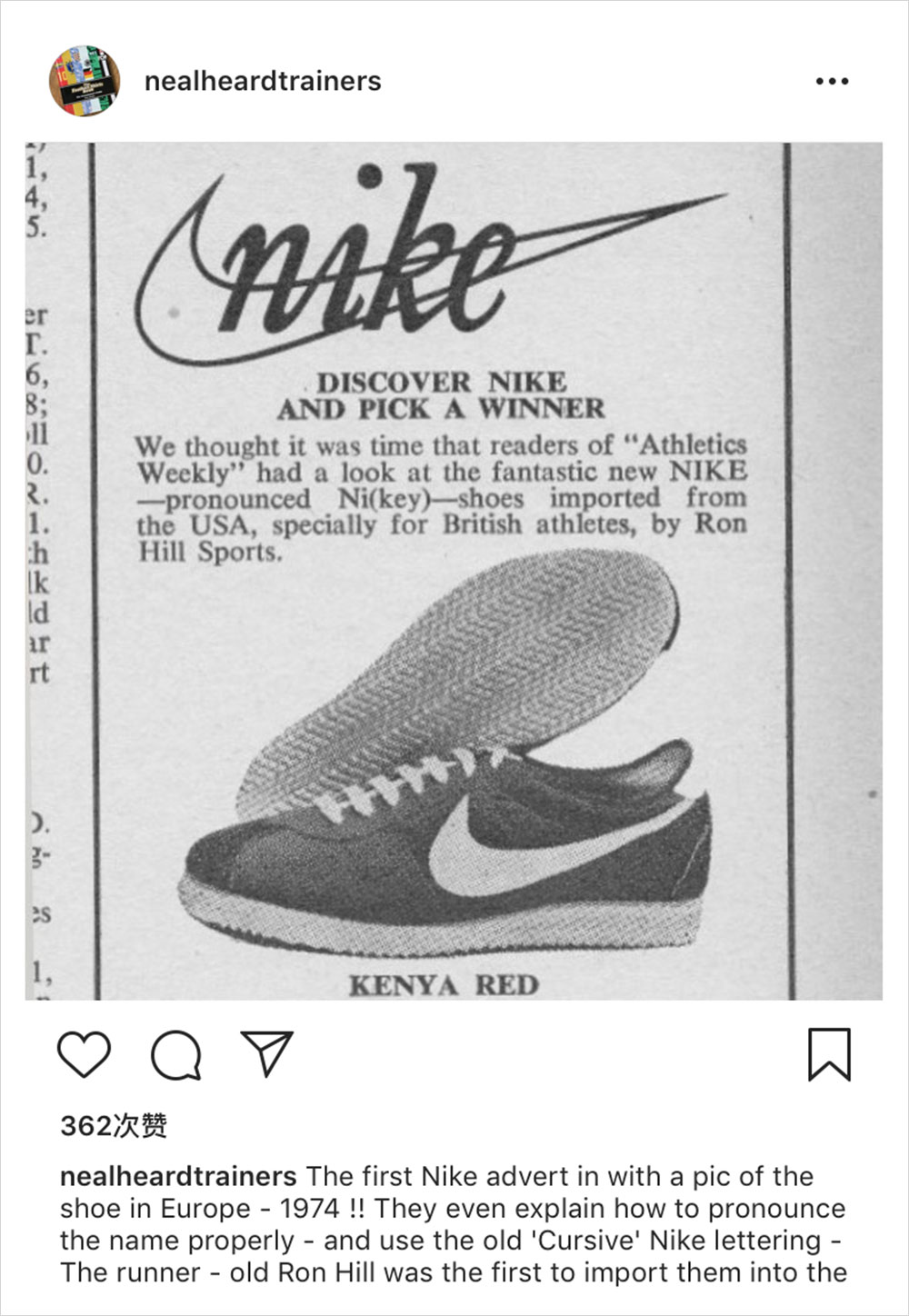 账号 @nealheardtrainers 日前向大家科普了下 Nike 的历史。在 1974 年,Nike 在欧洲地区发布了运动鞋产品的第一条广告,Nike 在这条广告中说明了 “Nike” 的正确发音,当时的品牌 Logo 使用的还是 Cursive 字体。当然了,Nike 发展至今已成为了运动品牌行业的翘楚,会念错这个品牌名字的人应该是少数了。