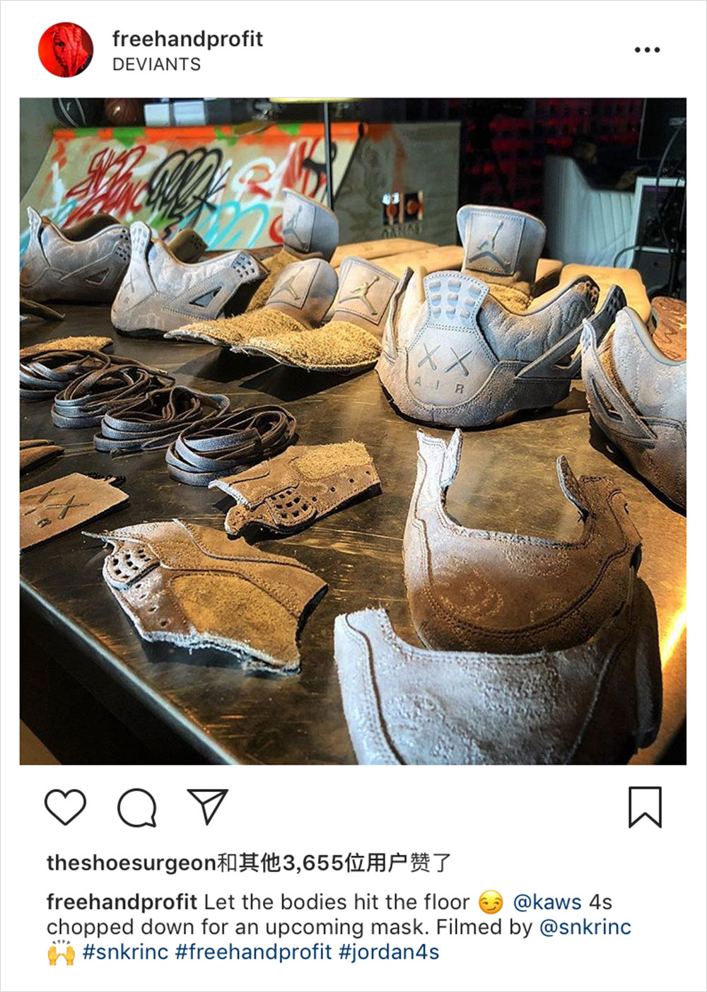 球鞋面具设计师 Freehand Profit 对于 Sneakerheads 来说绝对是再熟悉不过了,经常看我们报道的朋友们应该也了解,这位艺术家喜欢利用鞋款自身的特点将一双运动鞋以面具的艺术形式呈现出来。许多大家熟悉的热门鞋款都曾遭到这位面具大师的 “毒手” ,日前,Freehand Profit 将他的魔爪伸向了另一位艺术家 KAWS 的 Air Jordan 联名鞋上,可以看到他已经将此鞋款 “大卸八块” ,并准备制作了。不知出来后的成品会是什么样,你们期待吗?