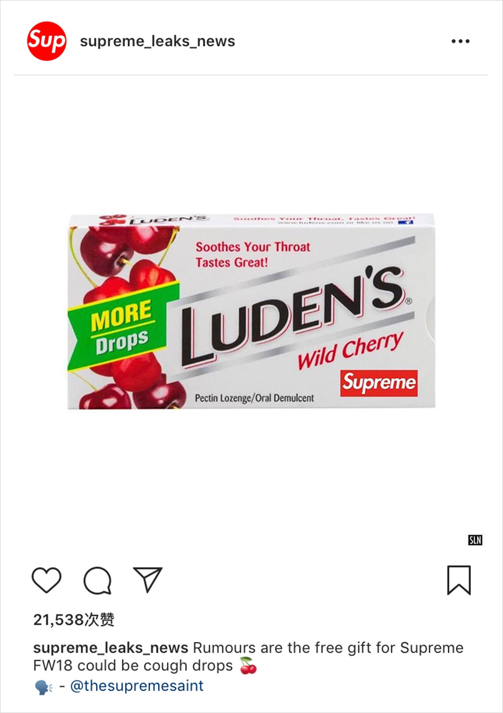 在我们于昨日报道了 Supreme 今年的秋冬系列会在下个月面世后,账号 @supreme_leaks_news 也正好在 Instagram 上曝出了关于这个系列的最新动态,那就是 Supreme 将要推出一款樱桃口味的喉咙含片作为购买秋冬系列商品的赠品,虽然很独特,但也很符合 Supreme 一贯的作风。那么问题来了,你们会舍得吃掉吗?