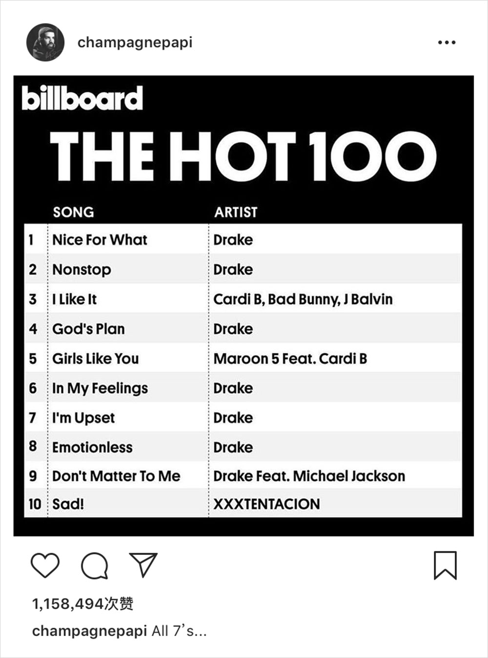正如大家期待的那样,Drake 新专《Scorpion》在一周内达到十亿流媒体后,果然登上了 Billboard Hot 100 ,就像你看到的,榜单前十里有七首《Scorpion》的歌,这一纪录打破了 The Beatles (甲壳虫乐队)在 1964 年创下的五首歌曲登入前十名的记录,同时也让 Drake 超越 Michael Jackson 成为第一个有三十一首 Billboard Hot 100 前十单曲的艺人,祝贺 Drake 。