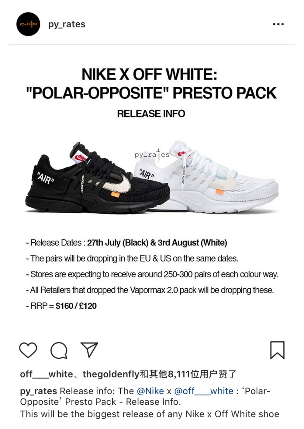 球鞋情报账号 @py_rates 日前曝出了 Virgil Abloh x NikeLab Air Presto 黑白两色的发售信息。从图片中可以看到黑色的发售时间是本月 27 日,白色是 8 月 3 日,将会在美国和欧洲地区各大零售商发售。但真正需要注意的,是庞大的发售数量,每款配色在一个店铺中可以得到 250 – 300 双的发售量。所以朋友们,机会来了!