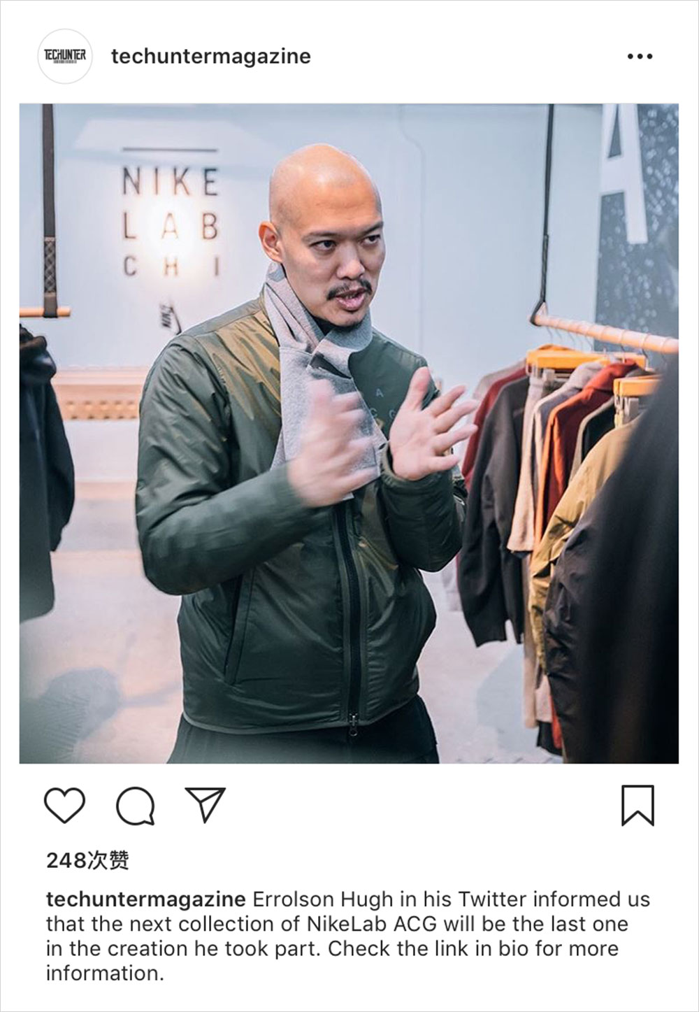 Nike 户外功能支线 NikeLab ACG 的成功重启和它背后的灵魂人物 Errolson Hugh 离不开关系,正是他的 “Urban Outdoor” 概念使得 ACG 得到了极被认可的革新。而这名设计师近日在 Twitter 上却透露出了将离开 NikeLab ACG 的消息。据了解,Errolson Hugh 正式离开的时间是在今年秋冬系列之后,也就是说今年 ACG 的秋冬系列是你们最后一次能买到 Errolson Hugh 在 Nike 推出的产品了,准备入手吧!