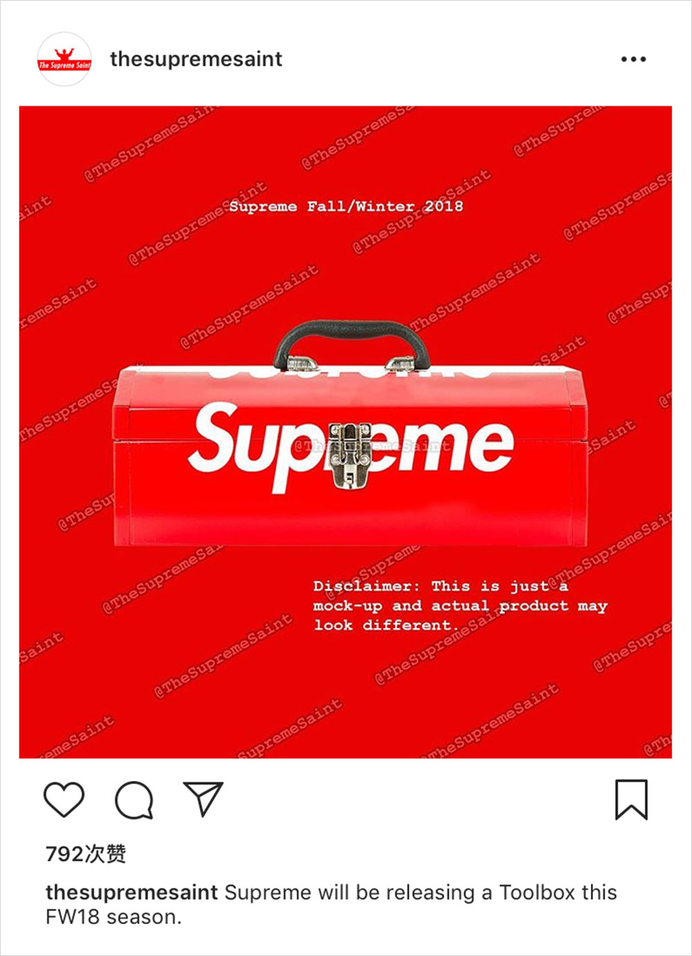 自从上一季的 Supreme 产品发售完毕后,外媒上关于该品牌秋冬季系列产品的新闻也是层出不穷。这不,情报账号 @thesupremesaint 日前又曝出了一款该系列配件产品的遐想图,可以看出图中是一个工具箱,只是不知道里面是否配有工具,如果是真的,你们以往买的 Supreme 的斧头、锤子之类的 “生活用品” 可就有地方装啦。