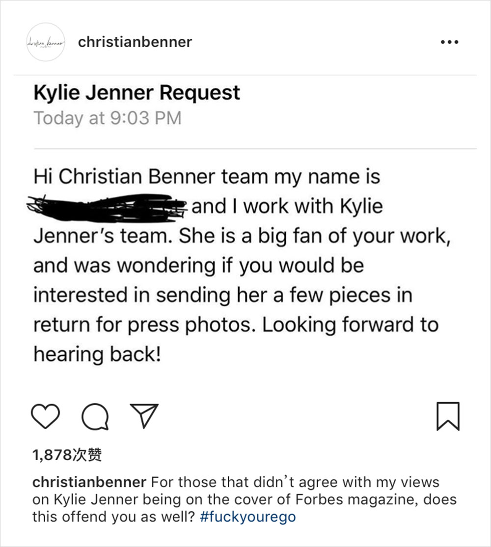 以摇滚朋克风格为主的手工服饰品牌 Christian Banner 日前晒了张图片引起了人们的深思,因为图片的内容是这家店铺收到了 Kylie 团队的邮件,说是希望 Christian Banner 可以给 Kylie Jenner 送些衣服,Kylie 会穿来拍些照片。对此不少人觉得是遇到骗子了,但也有人觉得,如果 Kylie 真的喜欢,那她应该花钱购买,对此你们怎么看呢?