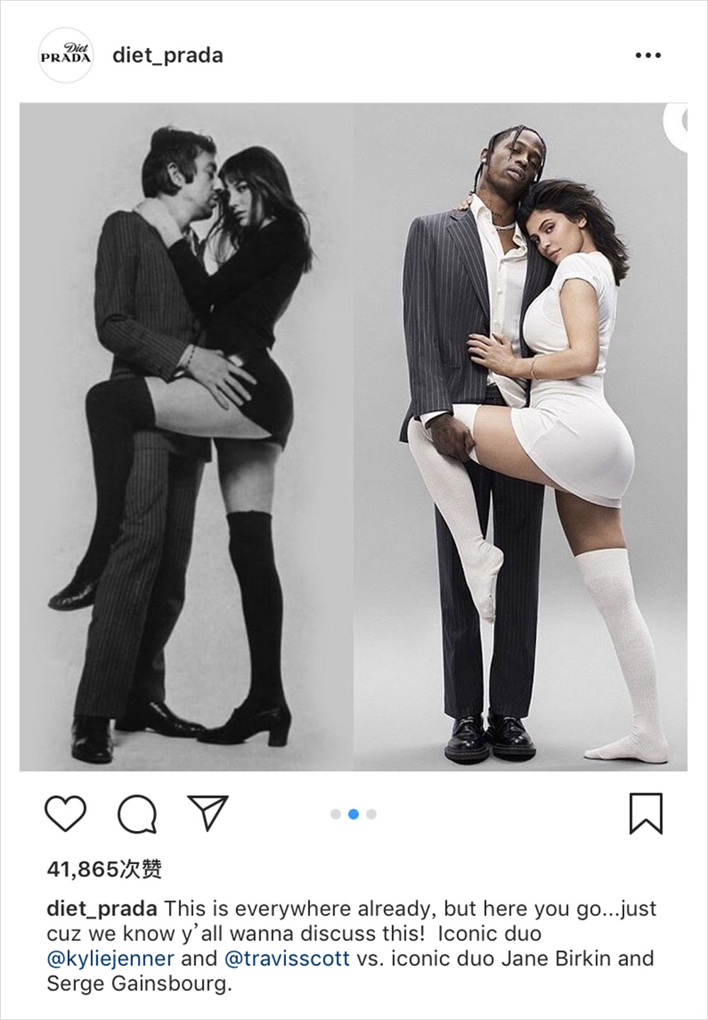 一直关注我们报道的朋友应该知道了 Travis Scott 与 Kylie Jenner 日前一同登上了《GQ》的八月刊封面,并拍了些照片分享于网路,但专揭发抄袭嫌疑的单位 @diet_prada 日前就指出这对夫妻在《GQ》拍的造型模仿了法国歌手 Serge Gainsbourg 和他当时的情人 Jane Birkin 在 70 年代所拍摄的写真集。可以看到三张照片里两对夫妻的造型、动作确实是十分相似的,但与其说是模仿不如说是 “致敬” ,因为 Serge Gainsbourg 的这组照片在当时是为了体现浪漫而性感的艺术美学,同时也是 “炫耀” 了一番两人的爱情,而这样的 “先例” 其实与 Travis Scott 和 Kylie Jenner 这对夫妻也很相似,一个是福布斯榜前三的成功企业家,一个是当下火热的说唱歌手之一,所以这对夫妻注定就是不平凡的,不是吗?