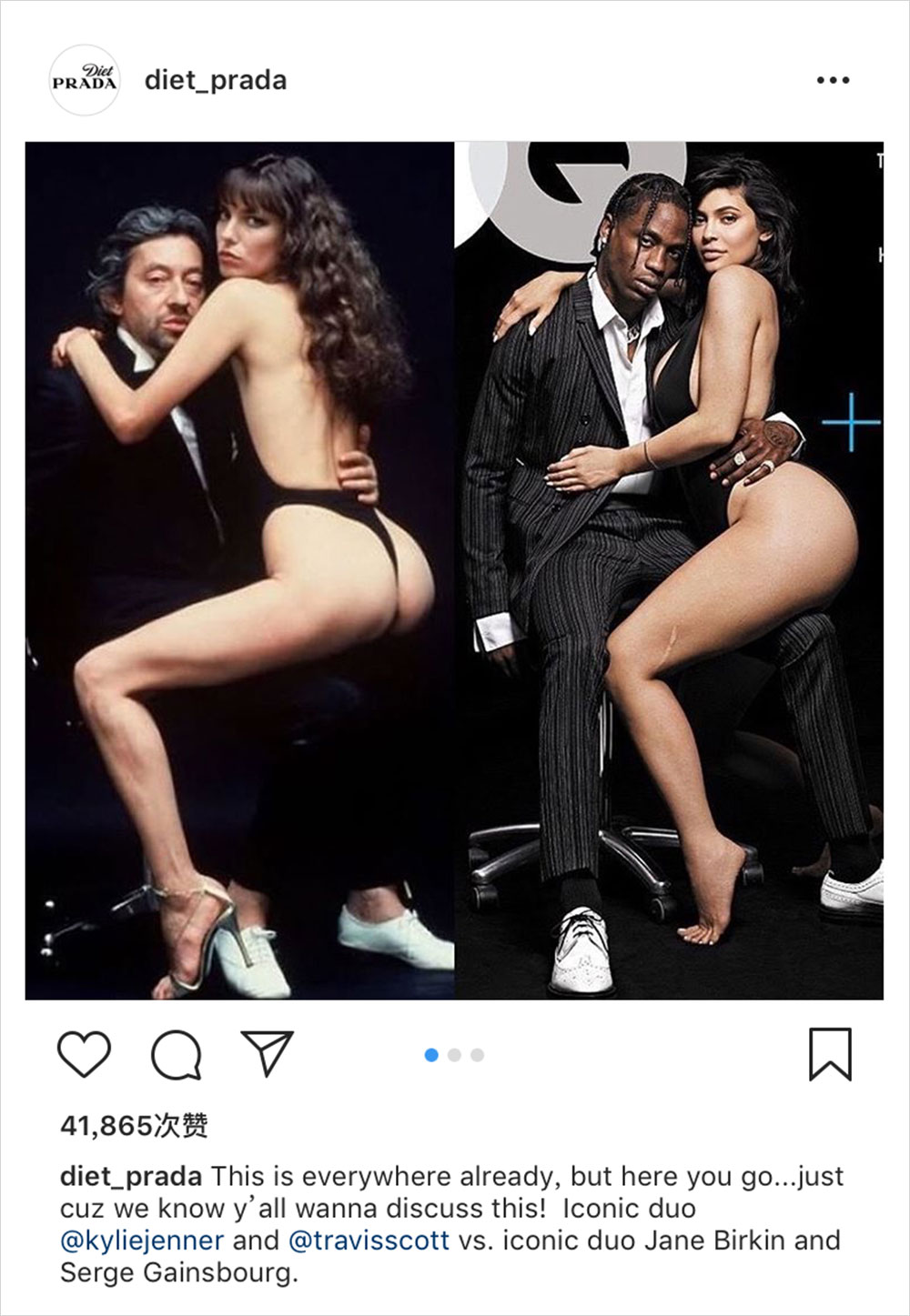 一直关注我们报道的朋友应该知道了 Travis Scott 与 Kylie Jenner 日前一同登上了《GQ》的八月刊封面,并拍了些照片分享于网路,但专揭发抄袭嫌疑的单位 @diet_prada 日前就指出这对夫妻在《GQ》拍的造型模仿了法国歌手 Serge Gainsbourg 和他当时的情人 Jane Birkin 在 70 年代所拍摄的写真集。可以看到三张照片里两对夫妻的造型、动作确实是十分相似的,但与其说是模仿不如说是 “致敬” ,因为 Serge Gainsbourg 的这组照片在当时是为了体现浪漫而性感的艺术美学,同时也是 “炫耀” 了一番两人的爱情,而这样的 “先例” 其实与 Travis Scott 和 Kylie Jenner 这对夫妻也很相似,一个是福布斯榜前三的成功企业家,一个是当下火热的说唱歌手之一,所以这对夫妻注定就是不平凡的,不是吗?