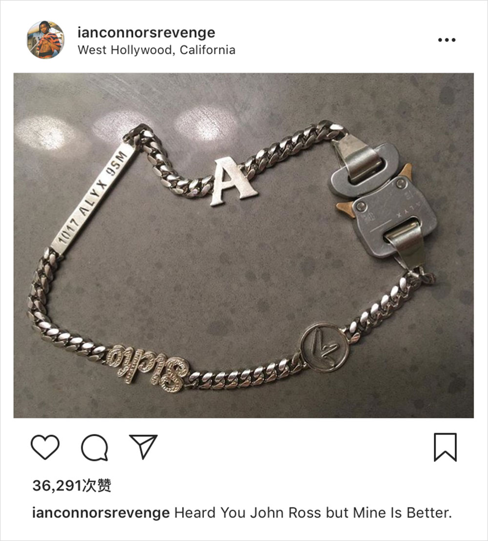 相信大家第一眼也对这张图片感到熟悉吧,毕竟 Matthew Williams 早前就曾经晒出过这么一款 ALYX 的全新配饰( 2019 春夏走秀上有出现过)。当时在项链上的细节还有金属材质的 Swoosh Logo 吊坠,而今天 Ian Connor 分享的版本则添加了一个 Sicko 的标志(据闻是他的全新服饰品牌),对比原版,你觉得哪个更好看一点呢?