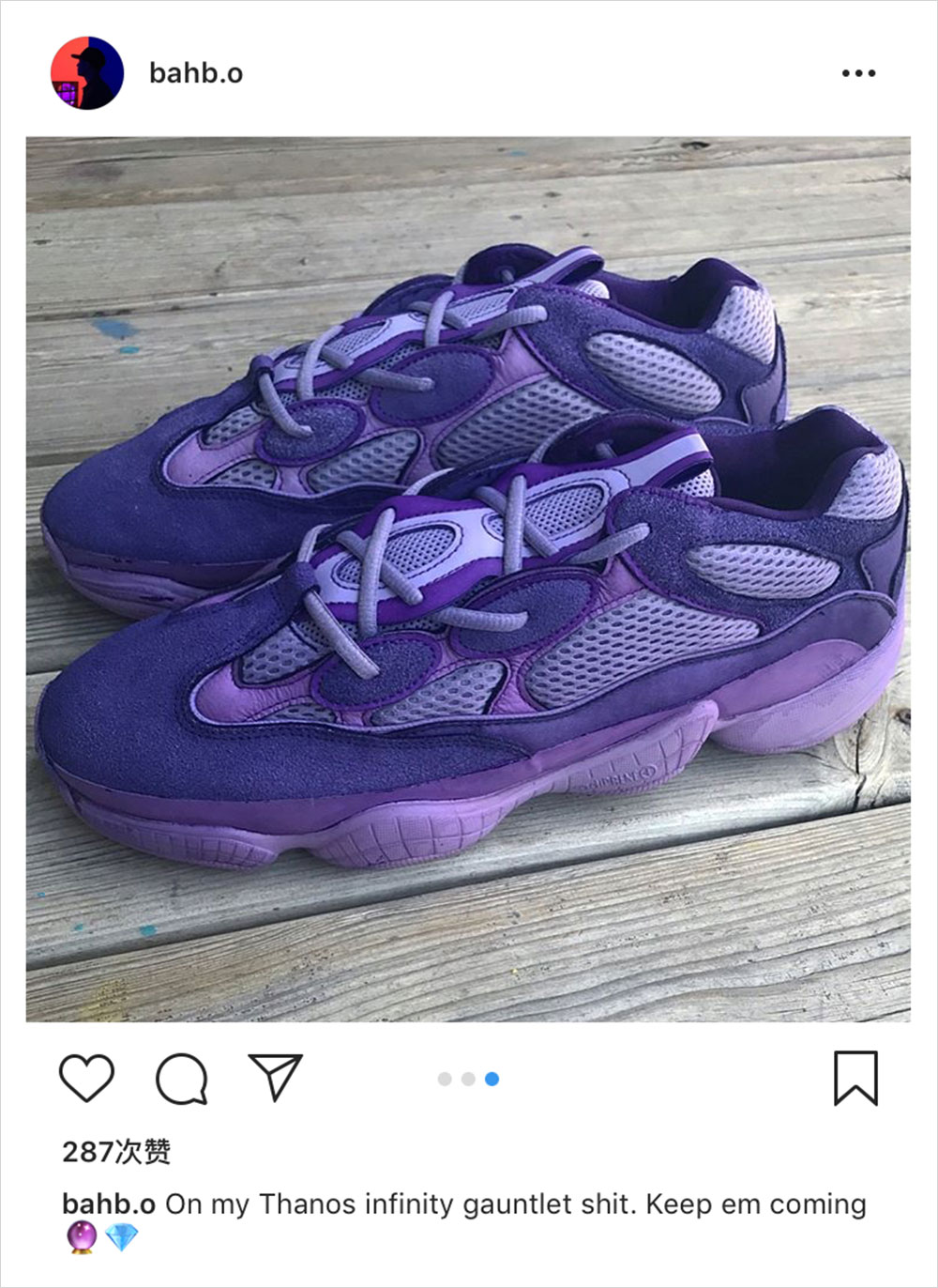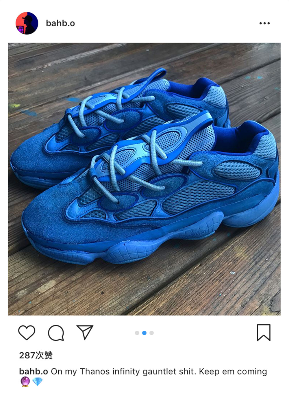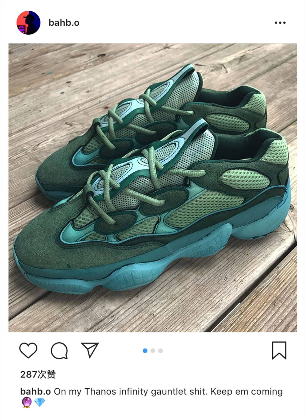 喜欢 YEEZY 鞋款的朋友都知道, YEEZY 500 到目前只发售了几个配色,也许并不能满足一些粉丝的要求。如果你不太喜欢目前流通市面的配色的话,不妨参考一下日前客制师 @bahb.o 在网络上分享的另外几个染制配色,效果显然不比原版差,可以看到鞋款被染得相当精致,颜色色阶在鞋子不同的材质下都被呈现得相当和谐,如果你有一定的动手能力,也可以尝试染制出自己感觉最理想的配色效果,毕竟俗语也有说:自己动手,丰衣足食。