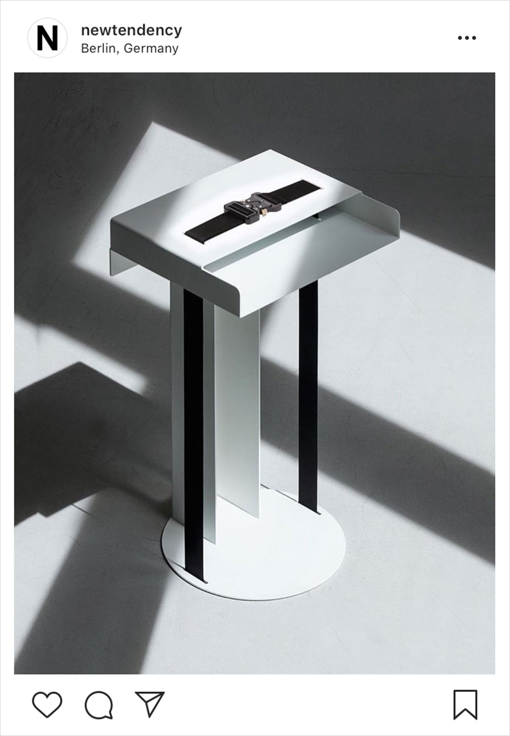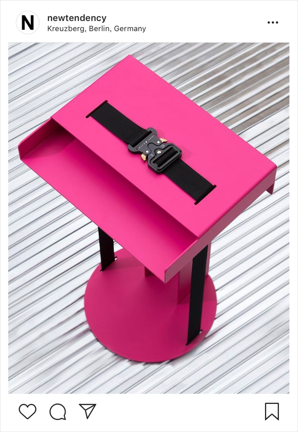 ALYX (1017 ALYX 9SM)的安全扣可以说是这个品牌最具标志性的产品了,除了腰带,这个安全扣还被用于推出手环、背带、甚至是项链等产品,但你绝对没想到它还能用于居家用品 —— 桌子上。早在去年,设计单位 New Tendency 就曾发布过一款和 ALYX 联名的家居产品,同样的,图片中的高脚桌也是 New Tendency 标志性的现代主义美学产品,融合了 ALYX 的安全扣后也显得设计感十足,日前,032C 就发布了该产品的发售信息,喜欢的朋友可前去购买,只是建议买之前考虑一下产品的实用性…… 你们怎么看呢?