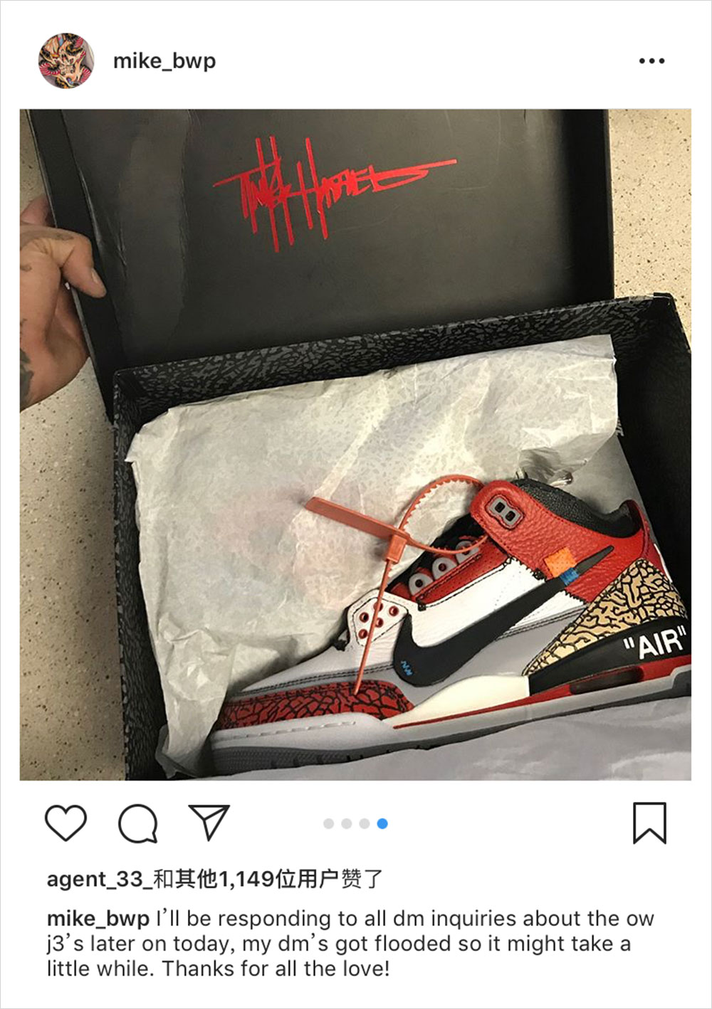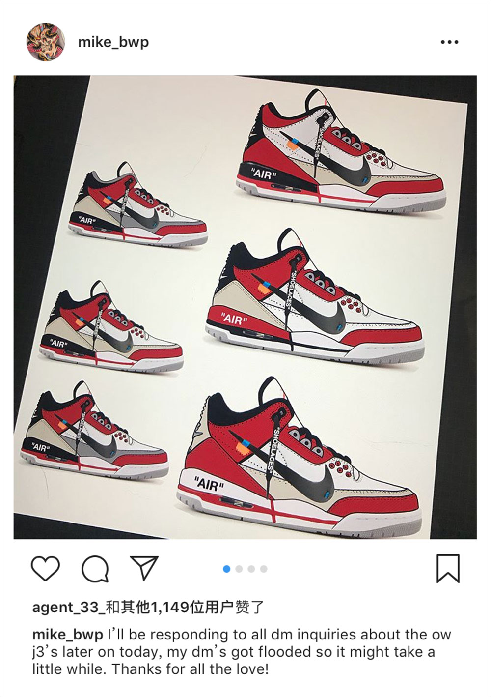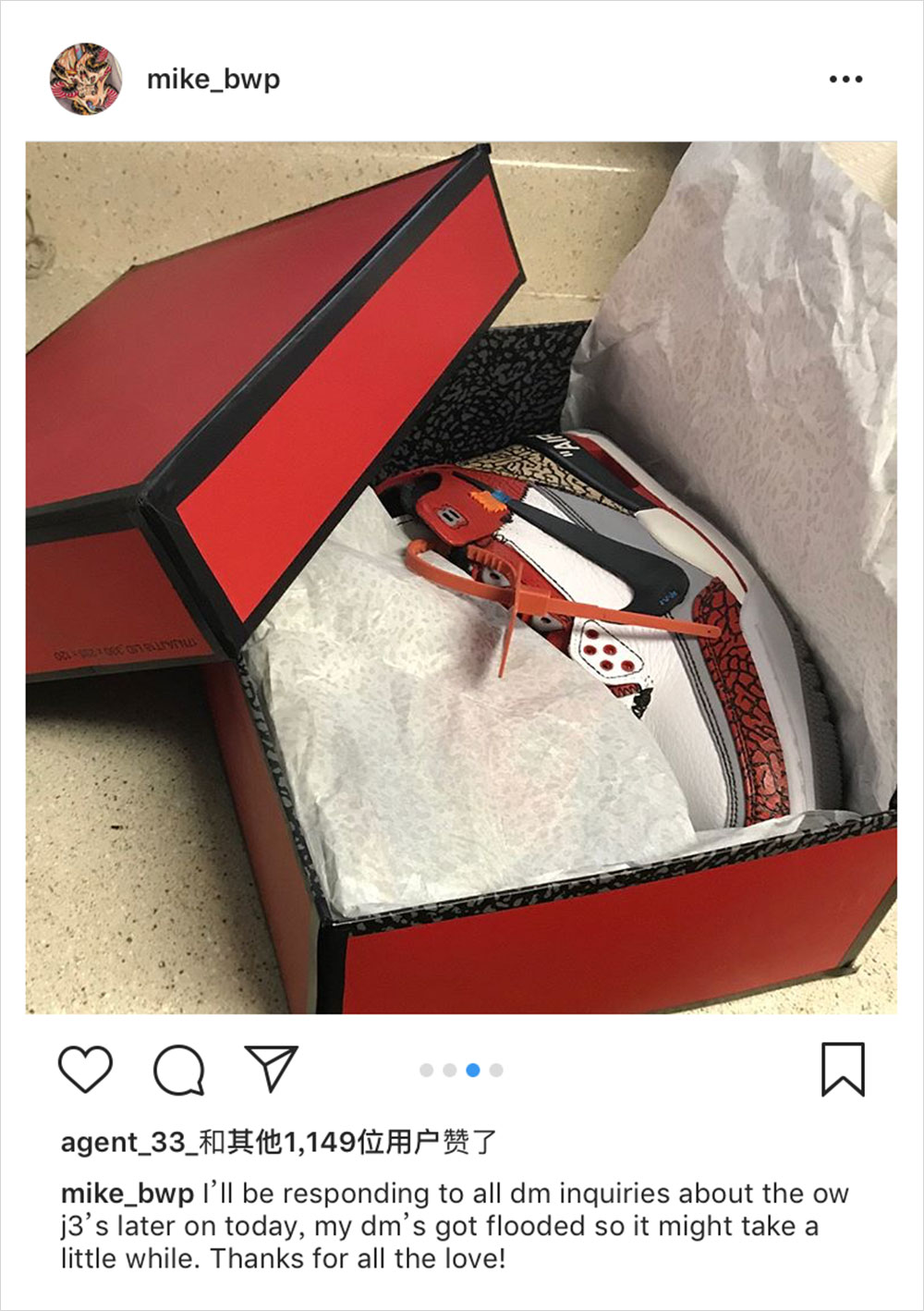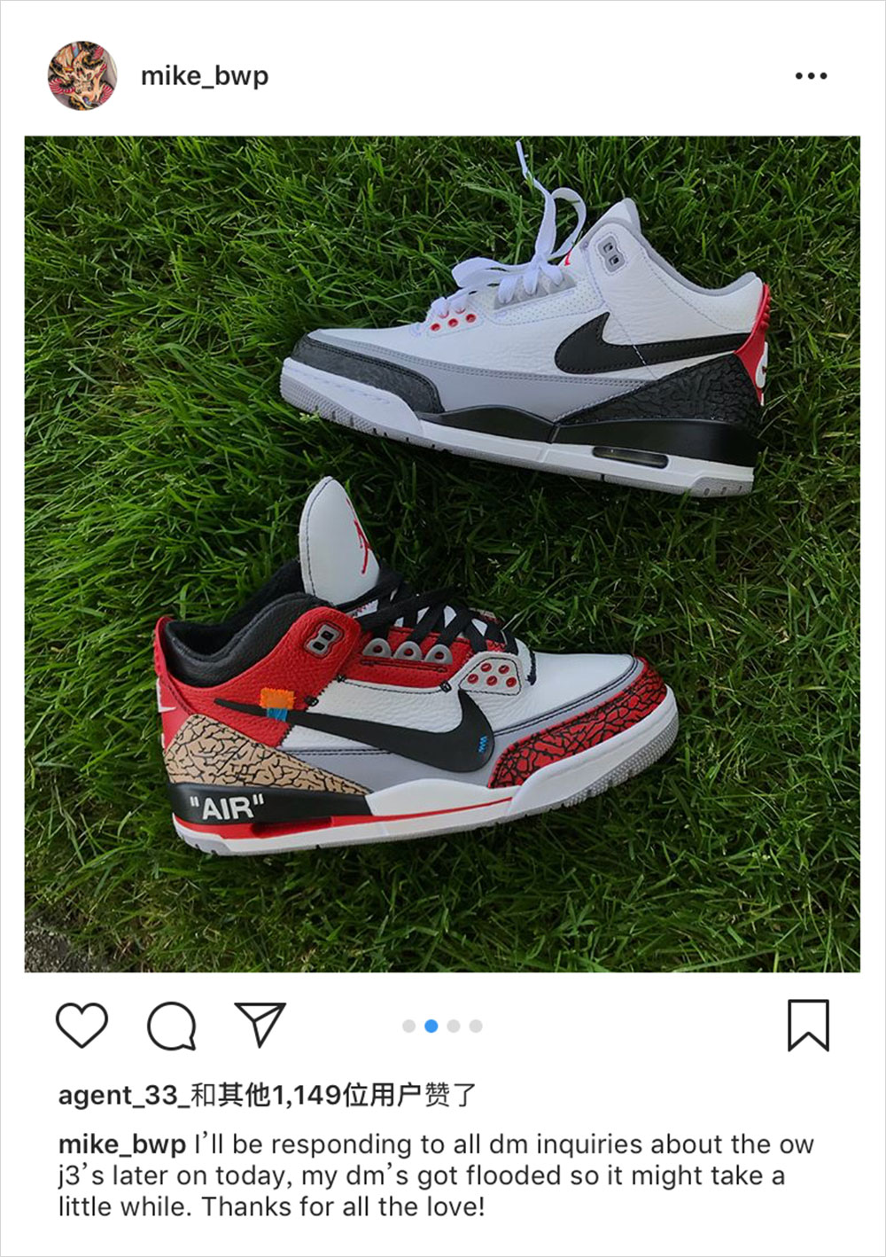 在 Virgil 操刀的 Nike 鞋款中,只有一双 AJ 鞋款,那就是 Air Jordan I ,这对于喜欢 Air Jordan I 以外鞋款的朋友似乎并不满足。日前,账号 @mike_bwp 就决定自己动手,把 Virgil 的设计搬到了喜欢的 Air Jordan III 上,呈现出来的效果似乎不比 Air Jordan I 差,你们觉得呢?