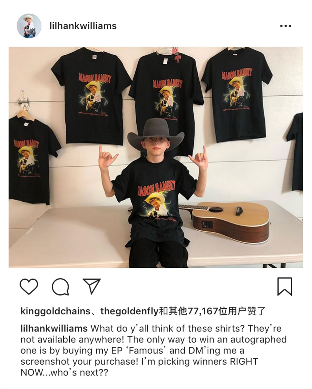 图片中的小朋友 Mason Ramsey 大家应该都很熟悉了吧,先是通过在沃尔玛的歌唱视频被大家所熟知,大火之后的他还曾出席了 Billboard Music Award 颁奖典礼。而日前这位小明星似乎学习了 Kanye West 的商业模式,出了自己专辑《Famous》的周边服饰,同时还是限量不可购买的,如果你想要这款周边的话得先购买他的专辑《Famous》,之后将购买凭证截图私信给他,Mason Ramsey 会在其中选出 10 个幸运粉丝送出这些周边服饰。大家是不是没想到,这个 “明日之星” 还有着如此优秀的商业头脑吧。