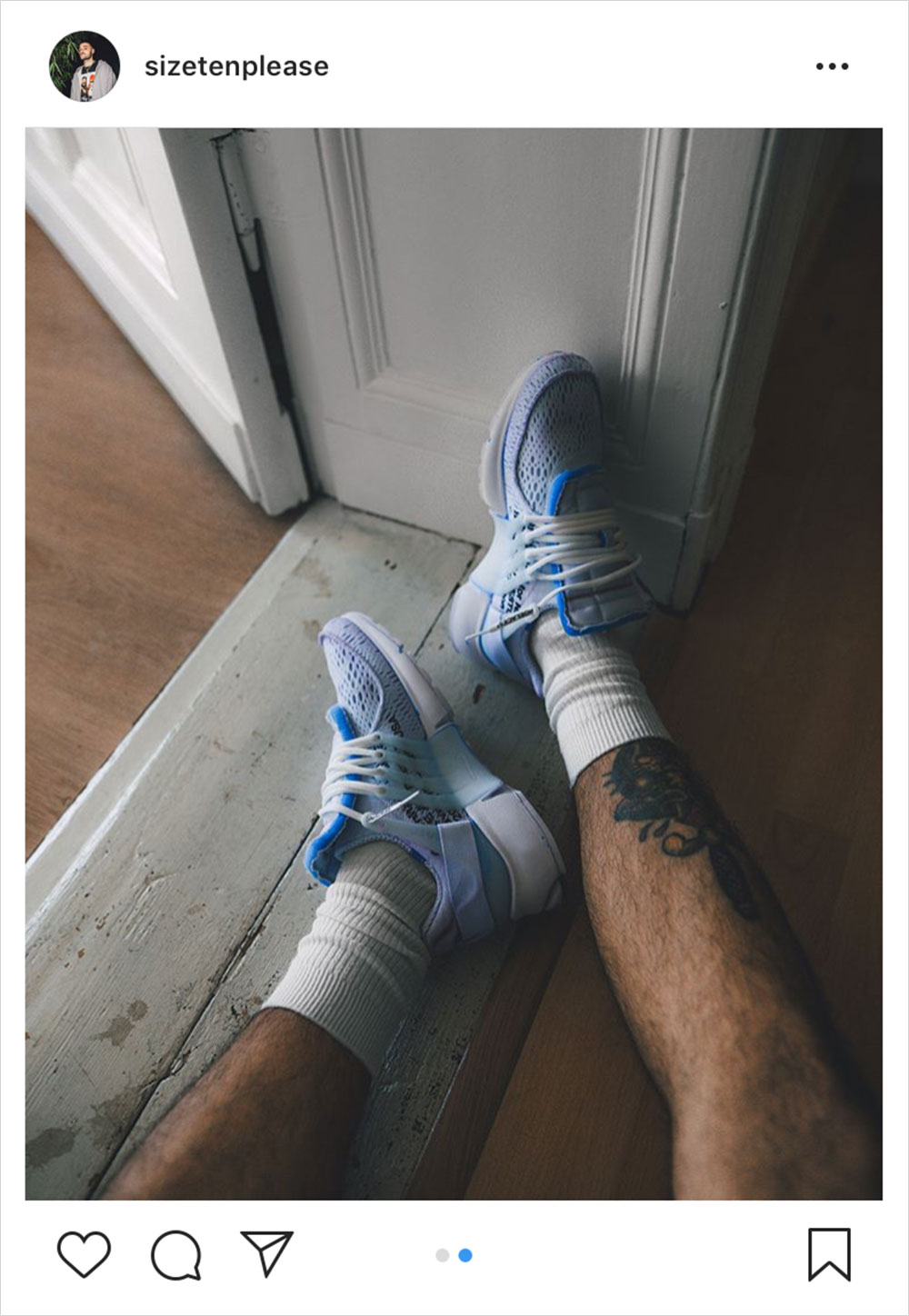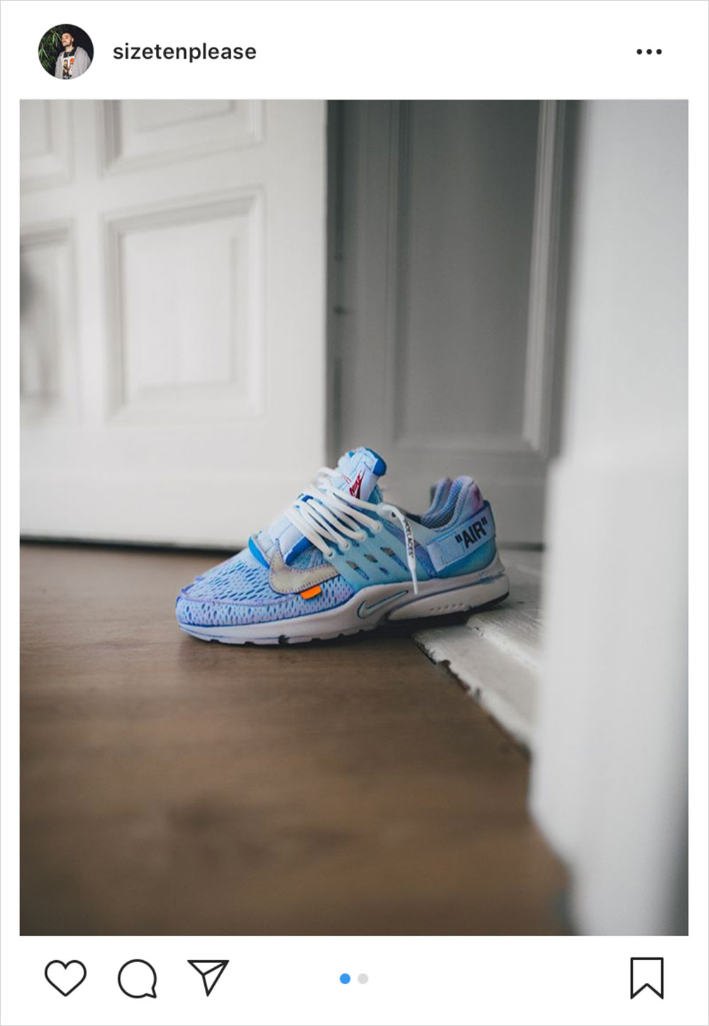 还有不到三天就将迎来 Virgil Abloh x NikeLab Air Presto 白色版本的发售了,相信不少人都非常期待吧(尤其是对上周没有买到黑色版本的朋友来说),对于此鞋,相信大家与好友之间都存在着一个话题,那就是 “白色好看还是黑色好看” ?账号 @sizetenplease 日前无疑给了大家第三个答案,就像你看到的,纯白的 Virgil Abloh x NikeLab Air Presto 被染成蓝色,但又不是纯蓝,有些 “白里透蓝” 的既视感。这无疑给了大家一个好的借鉴,如果三天后你不满足于白色,那就自己动手吧!
