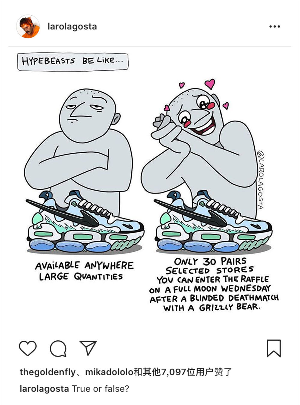爆款、限量、抽签等只要是不容易购买的鞋款,似乎成为了当下多数人对一双鞋款疯狂追求的 “标准” ,相反的,一旦这是一双可以随意购买的鞋款,相同设计下的鞋款似乎就没什么人愿意去搭理了。相信这样的现象在你我之中都普遍存在,日前艺术家 @larolagosta 就通过一副插画赤裸的嘲讽了这个现象,大家对此又有怎样的评价呢?
