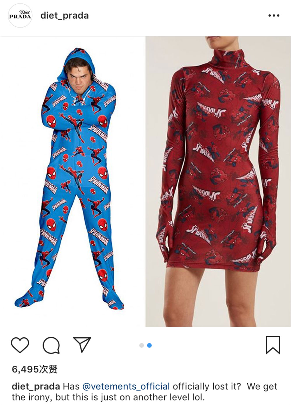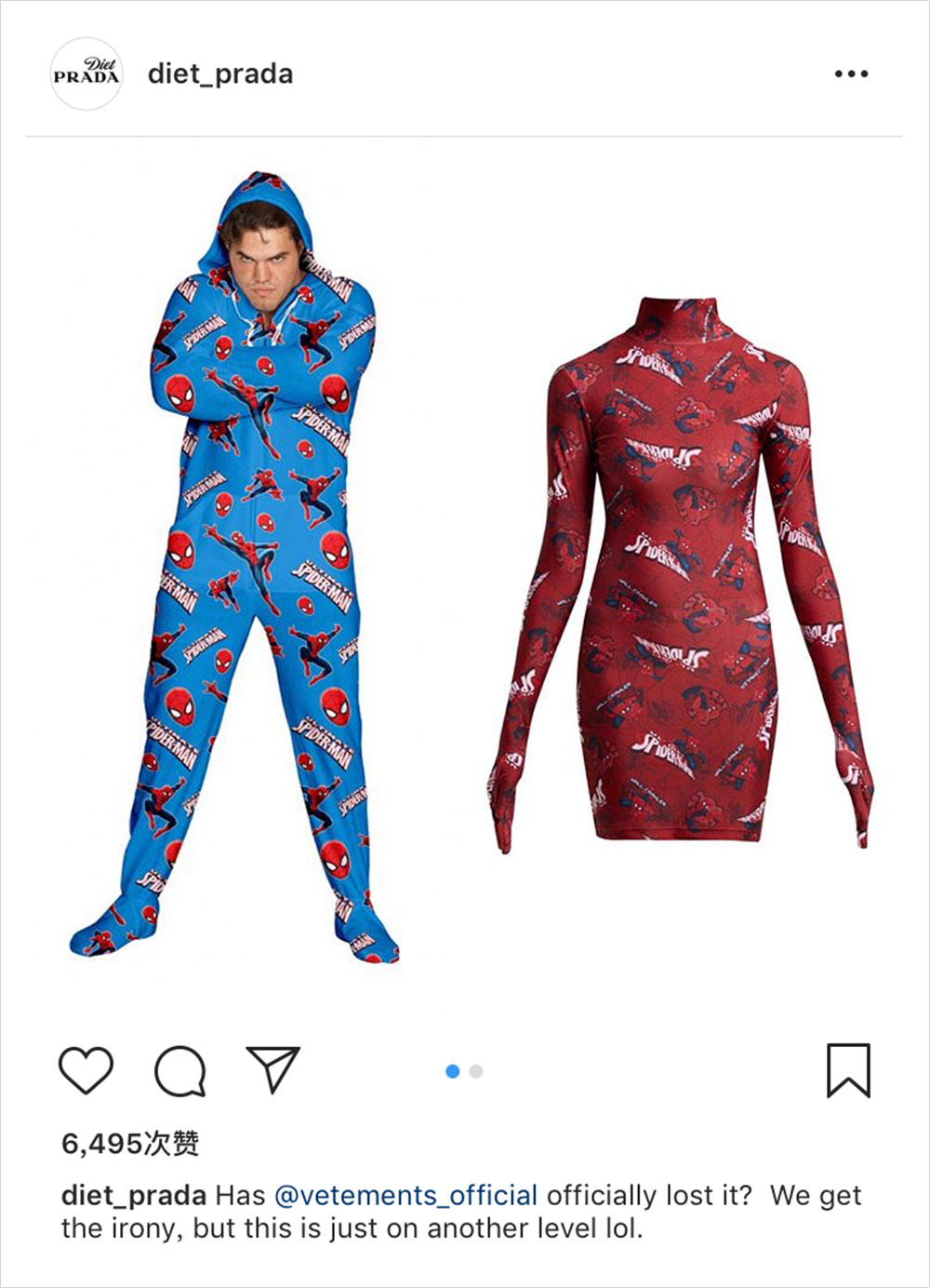 “时尚警察” @diet_prada 日前再次出击,这次是 Vetements ,就像你看到的,图左的连体睡衣与图右的 Vetements 连衣裙都是相似的 “蜘蛛侠” 印花图案,整体上看两者都有 “连袖” 设计,细看,就连 “Spider-Man” 的字体和排版都几乎一样。都说艺术来源于生活,Vetements 这是直接照搬了吧……
