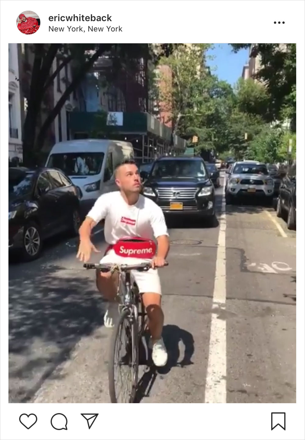看了昨天《墙外世界》的朋友一定还记得花式秀收藏的 Supreme 玩家 @ericwhitebac 吧?自 Supreme 上了纽约邮报的封面后,Eric Whiteback 发现乒乓球游戏已经满足不了自己了,就去买了一些 Supreme 的纽约邮报,骑着单车,玩起了 “送报的小行家” 这一角色,可以看到炒到一二百的 Supreme 报纸,Eric Whiteback 是直接就丢了出去,非常大方…
