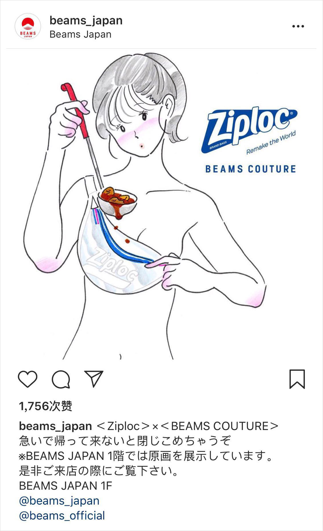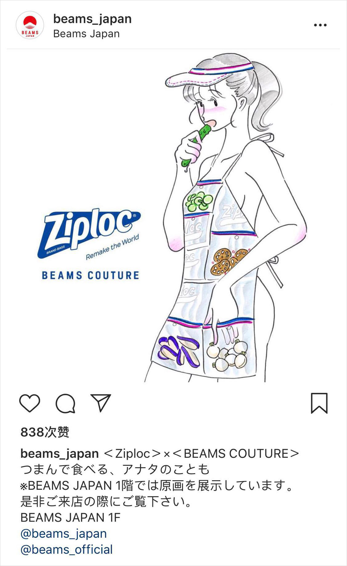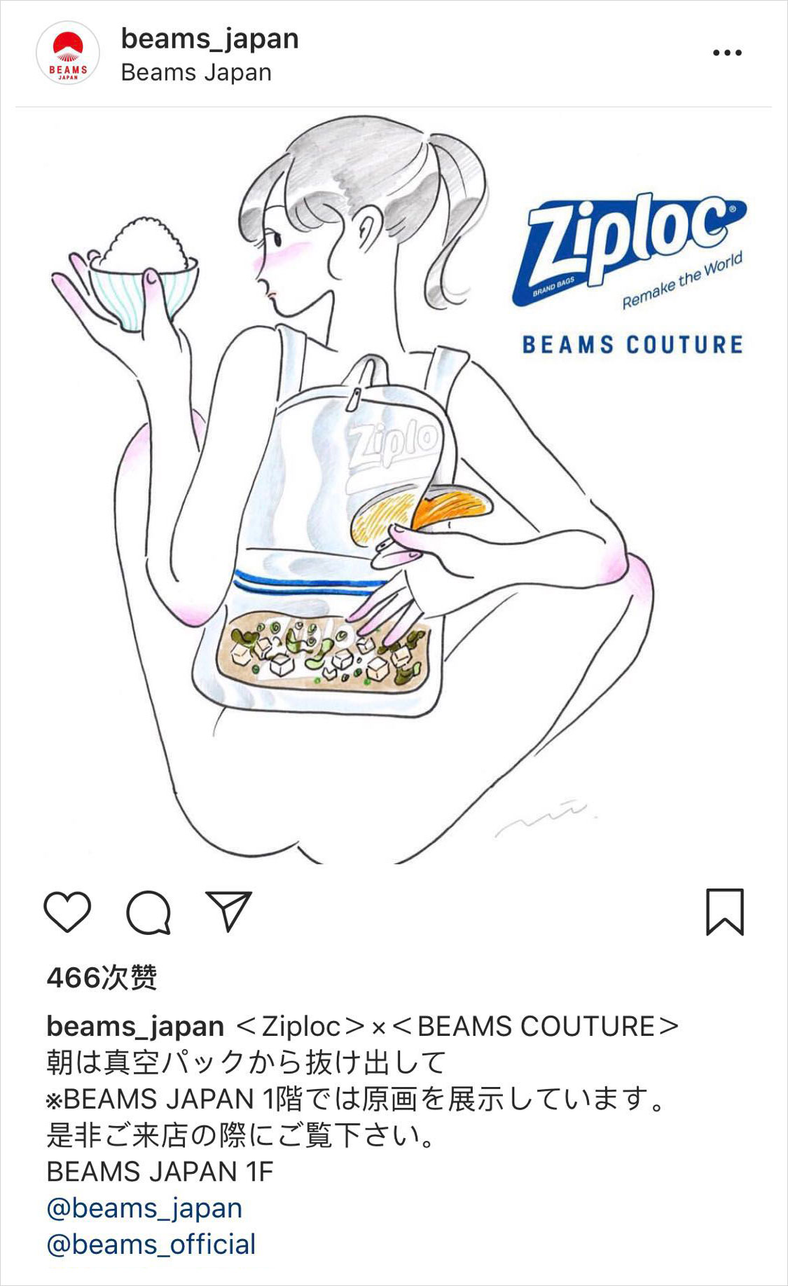 Beams 近日与密封保鲜袋品牌 Ziploc 展开了联名合作,双方将生活用品和服装进行了结合,推出一系列以密封袋为灵感的服饰产品,其中最具代表性的应该就是围裙了。在 Instagram 上,就有插画师将这一合作的使用通过绘画表现了出来,或许,把食物穿在身上真的比饭盒更方便呢?