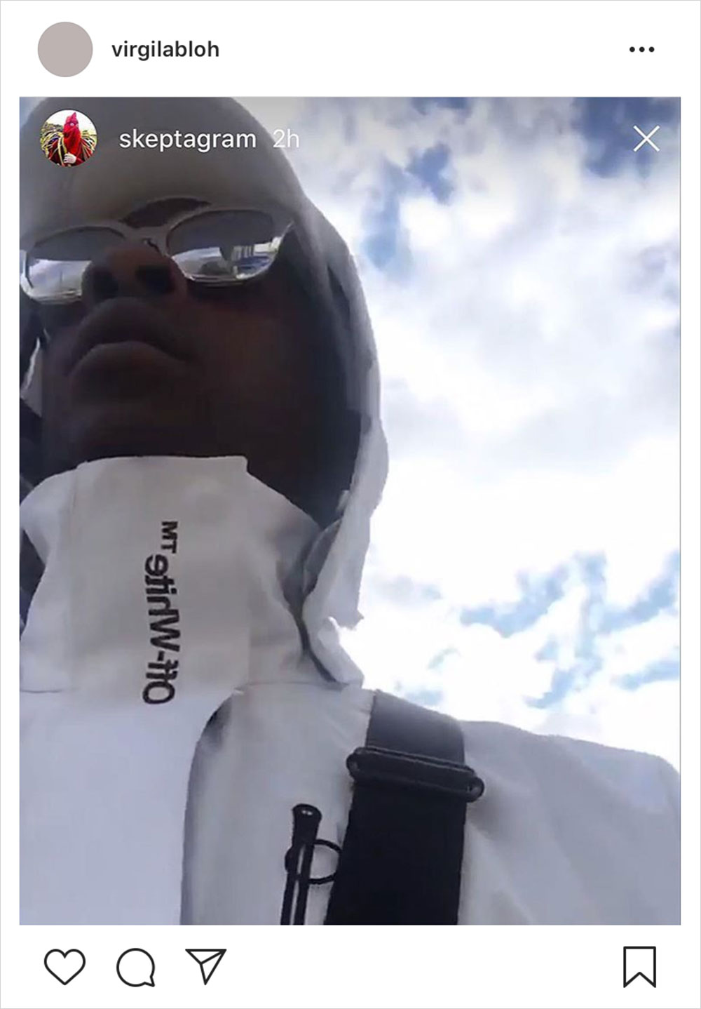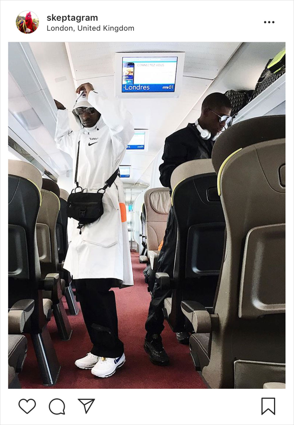 大家都还记得今年世界杯期间 Nike 联手 Off-White™ 打造的足球系列吧,时隔两月,英国说唱歌手 Skepta 近日就在 Instagram 上曝出了双方未曾公布的新联名。图中不难看到他所穿着的风衣夹克上领口处的 Off-White™ 字样以及胸口处的 Nike Logo ,虽然看不出服饰完整的设计,但这样的设计与 6 月份双方联名中的黑色风衣夹克非常相似,所以有可能是该款式还未公布的白色版本。