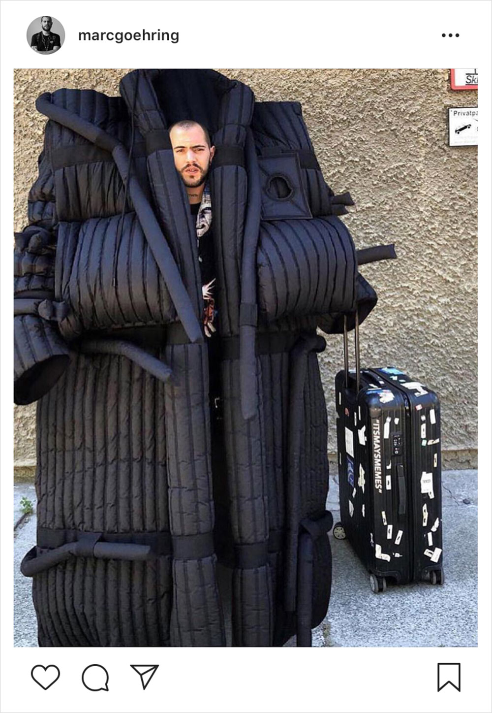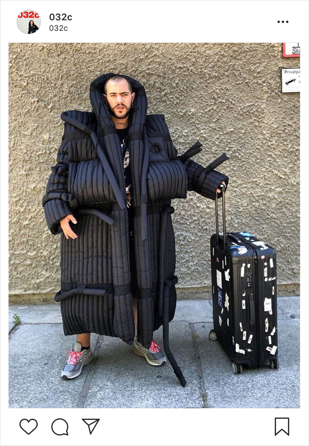 不久前蒙特利尔潮流名所 SSENSE 把 Moncler x Craig Green 今年 2 月在米兰发布合作时的部分夸张设计重新带回到了人们面前,虽说当时人们都看到了 Moncler x Craig Green 推出的超大羽绒服,但并不属于市售款,仅为了让消费者理解设计师天马行空的脑洞。而 032C 的时装总监 Marc Goehring 近日却在他的旅途中上身了这件超大羽绒服,可以看到服饰确实和 2 月份亮相的设计一样,穿上之后会包裹全身,效果十分夸张,尤其是 Marc 给自己的上身图添加了放大效果的恶搞后,更明显了……