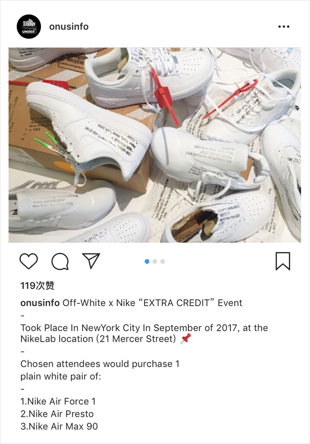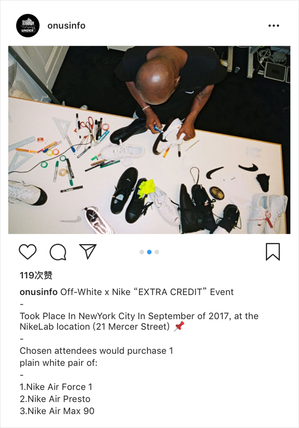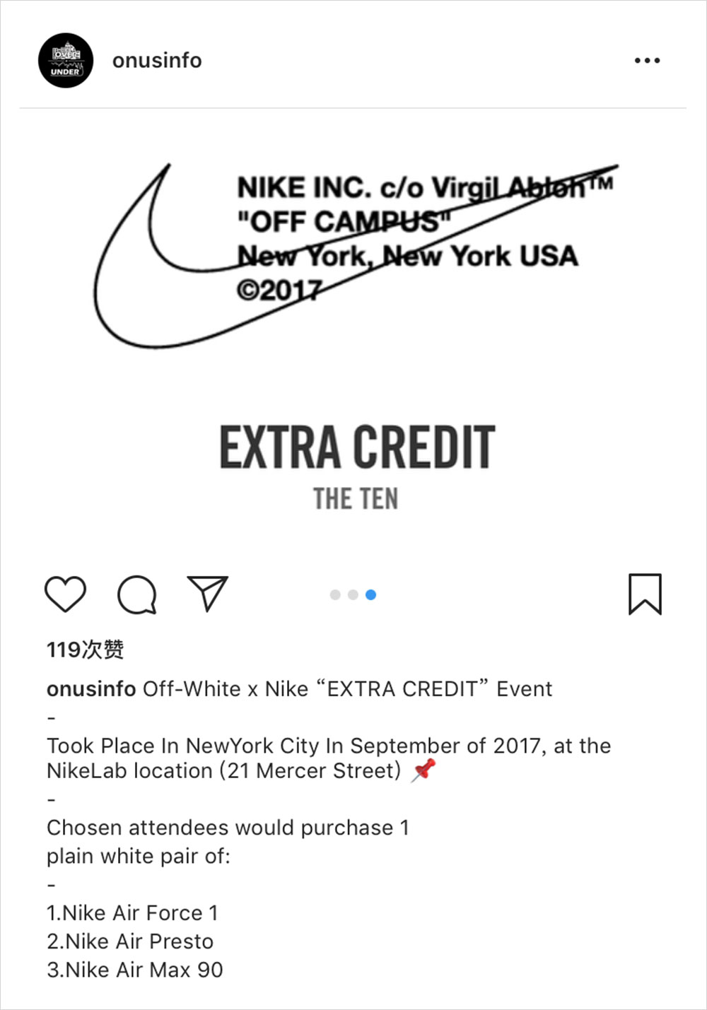 2017 年迎来了火热系列 The Ten 的发布,在当时经历了一系列的谍照曝光后,大家也终于在 Virgil 举办的 “Off Campus” 店铺企划中完整看到了联名的官方首秀。虽说不能购买,但主办方还是很贴心的给来参观的鞋迷们准备了一个 “后备方案” ,那就是提供官方一次免费的定制服务,你只要在活动期间于 NikeLab 21 M 店内购买纯白色的 Air Force 1、Air Max 90 和 Air Presto 其中一款,工作人员就会在你的新鞋上添加防盗扣和鞋侧面以及鞋带上的印花等在 The Ten 上才会出现的专属设计。虽说至今已时隔一年,但你如果还喜欢这种设计的话不妨自己动手试试看,我们也曾有提供过 “教学” 哦。