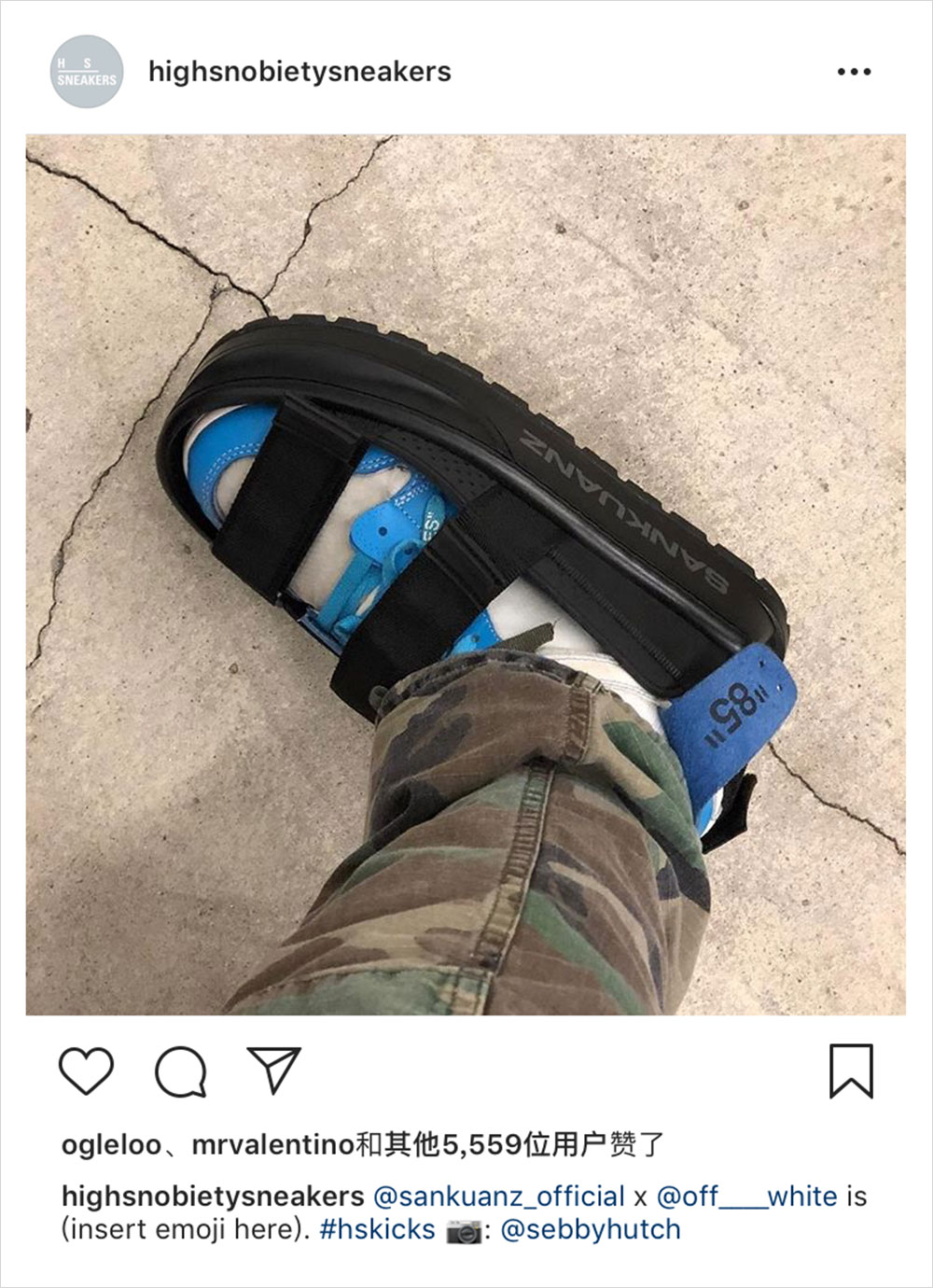 由上官喆主理的品牌 SANKUANZ 在今年春夏推出了一款中底造型夸大的凉鞋单品,日前就有网友利用这一点,直接穿着 Virgil Abloh x Air Jordan I “UNC” 上脚了这双凉鞋,这样也算是一次自主联名了吧…
